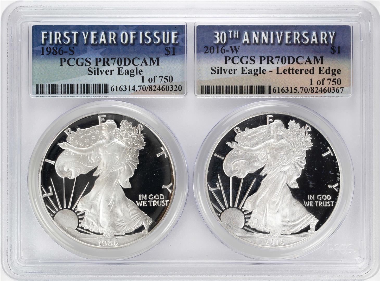 1986-S & 2016-W $1 Proof American Silver Eagle Coin Set PCGS PR70DCAM