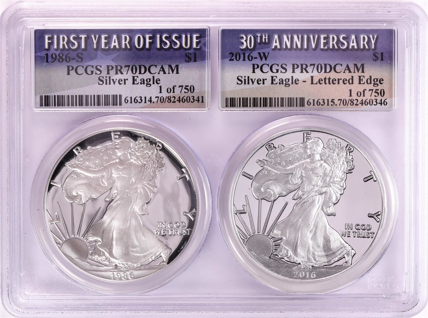 1986-S & 2016-W $1 Proof American Silver Eagle Coin Set PCGS PR70DCAM