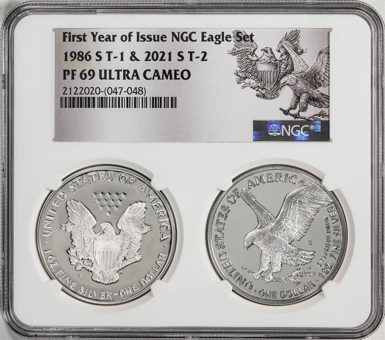 One 1986-S & 2021-S First Year of Issue $1 Proof Silver Eagle Coin Set NGC PF69 Ultra Cameo. NGC Certified.