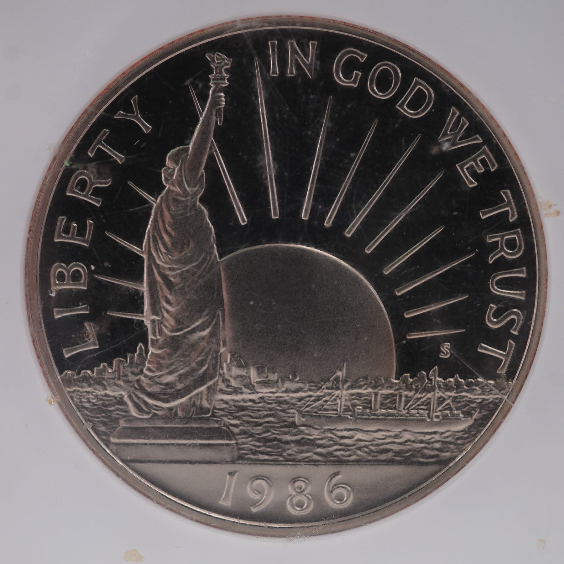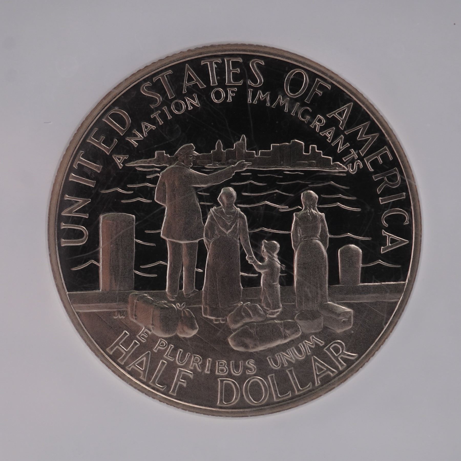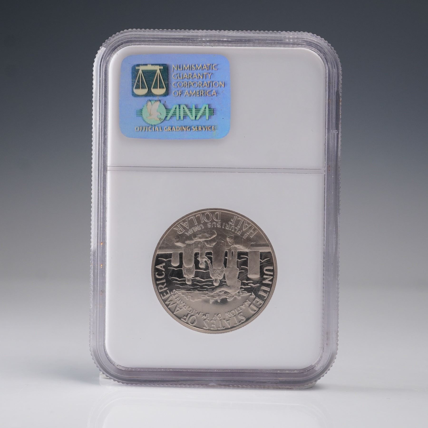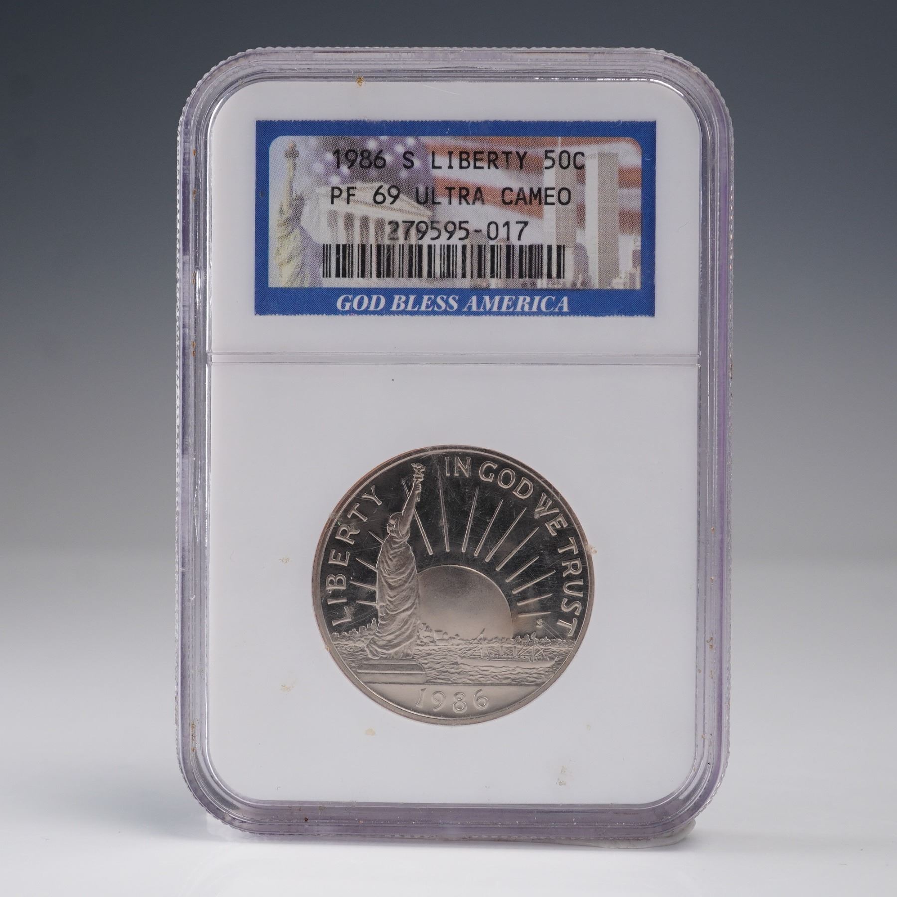 Struck in 1986 by the San Francisco Mint and graded PF 69 Ultra Cameo by NGC. This Liberty Commemorative Half Dollar celebrates the centennial of the Statue of Liberty and America' legacy as a nation of immigrants. The obverse showcases a powerful depiction of the Statue of Liberty in front of a radiant sunburst, accompanied by the inscriptions "LIBERTY," "IN GOD WE TRUST," and the year "1986." The reverse presents a poignant tableau of an immigrant family gazing across New York Harbor at the Manhattan skyline, with the words "UNITED STATES OF AMERICA," "A NATION OF IMMIGRANTS," and "E PLURIBUS UNUM" encircling the image, alongside the denomination "HALF DOLLAR." Housed in a NGC graded holder for further preservation and authentication. Slab measures: 2.25"L x 0.25"H x 3.25"H. Coin diameter: 30.61 mm.