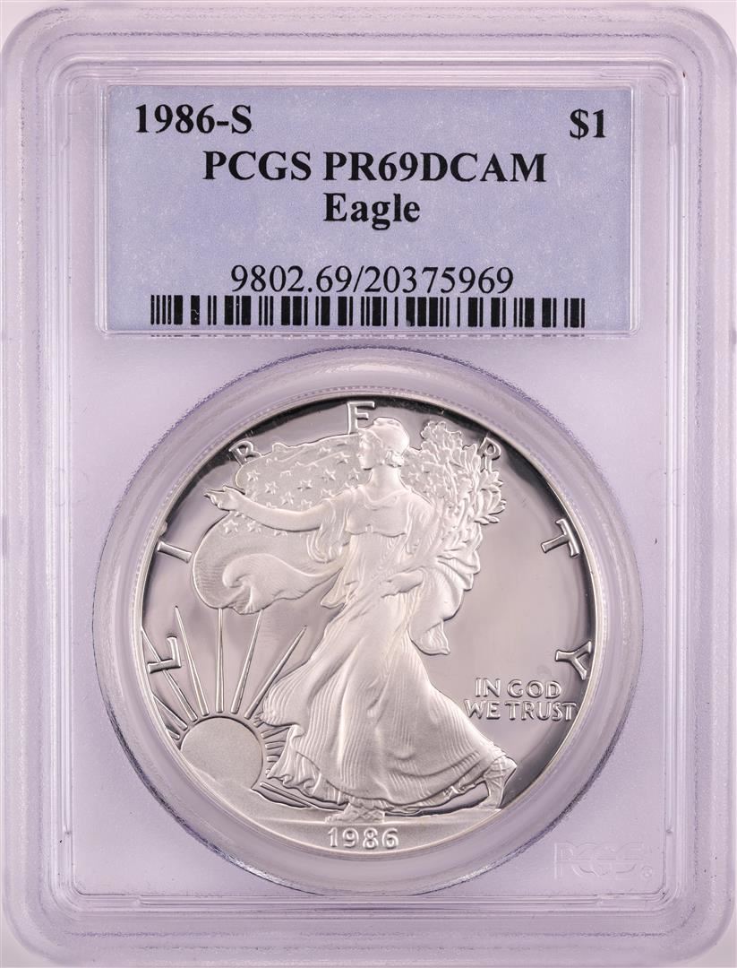 One 1986-S Proof $1 American Silver Eagle Coin PCGS PR69DCAM. PCGS Graded.