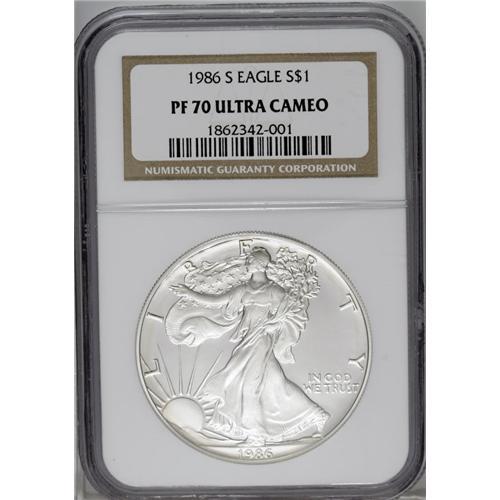 <B>1986-S<img border='0' src='http://www.heritagecoins.com/images/star.gif' width=10 height=10>$1> Silver Eagle PR70 Ultra Cameo NGC.</B></I> Perfection from this initial year proof, with dazzling contrast. <BR><BR><B>Important notice:</B> Heritage usually auctions material at the rate of 200-250 lots per hour. On some occasions eBay Live bid software or the Internet may not be able to keep up with the pace of the auction. We recommend placing a realistic absentee bid now as insurance to avoid disappointment. Occasionally the auctioneer may eliminate or reject an eBay Live bid, and the auctioneer may also reopen a lot after the close of the eBay live bidding (usually because we missed an audience bid), and may reject your bid even if it shows you as the winning bidder. By bidding via eBay Live, you agree that Heritage may award the lot to another bidder at its sole discretion under the circumstances described above or any other reasonable circumstances. Since eBay bids are not shown to us until we open the lot on the floor, we treat those bids just like floor bids. In most cases the floor responds before the eBay bid is presented to us, due to Internet lag time, so for consistency we have made it a policy that floor bids are always considered first over tie eBay live bids. Also please note that all Heritage lots purchased through eBay Live carry a 20% Buyer's Premium. Please make sure you read the Terms and Conditions before you bid. This lot is being auctioned in conjunction with a live floor auction by Heritage Galleries & Auctioneers. All final auction and invoice information will be supplied by Heritage Galleries & Auctioneers, and all other information should be considered preliminary. Lot:5201 <BR><BR><B>Winning Notification and Billing:</B> After the FINAL session in this auction is complete, Heritage will send e-mail and snail mail invoices. This process normally takes several days. All final auction and invoice information will be supplied by Heritage Galleries & Auctioneers, and all other information should be considered preliminary. <BR><BR>This auction will be conducted on a live auction floor and over the Internet through eBay Live. If you choose to place an absentee bid, please take a moment to <font color='#0000ff'><u><a href='http://pages.ebay.com/liveauctions/help/before/laabsentee.html'>learn how eBay Live absentee bidding works</a></u></font><font color='#000000'>