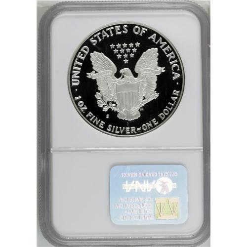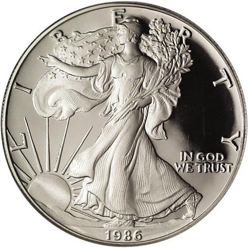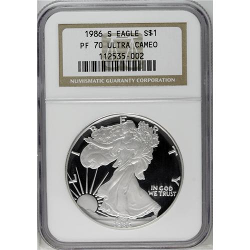 <B>1986-S<img border='0' src='http://www.heritagecoins.com/images/star.gif' width=10 height=10>$1> Silver Eagle PR70 Ultra Cameo NGC.</B></I> A perfect proof example with complete contrast. This example represents the first year that American Eagle silver and gold coins were struck.