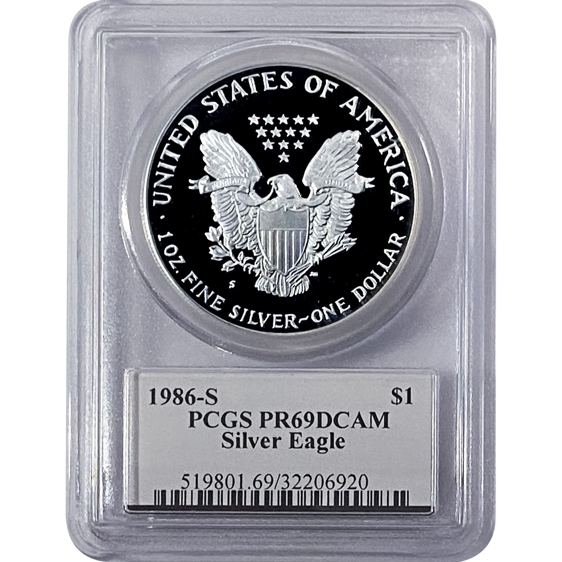 1986-S Silver Eagle PCGS PR69 DCAM Mercanti