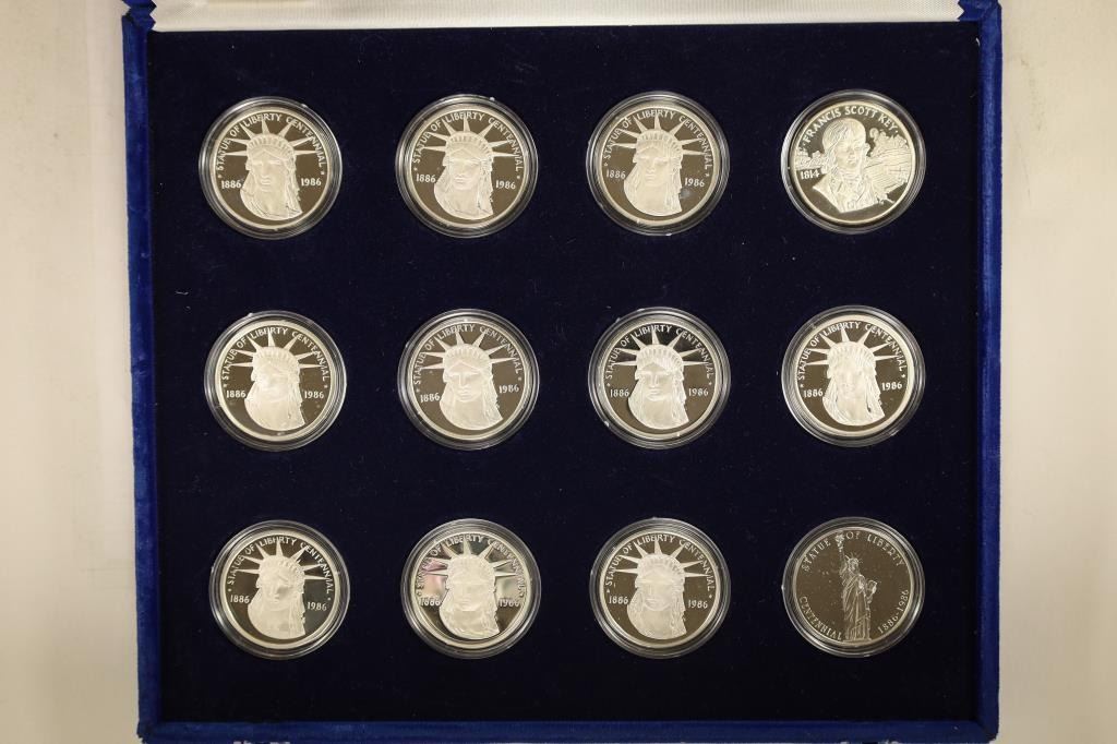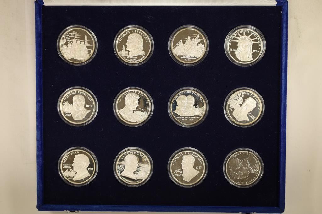 STERLING SILVER MATCHED-NUMBER EDITION. 12 COINS IN BLUE VELVET CASE. EACH COIN WEIGHS 28.35 GRAMS FOR A TOTAL OF 340.2 GRAMS (10.94 OUNCES OF STERLING SILVER)