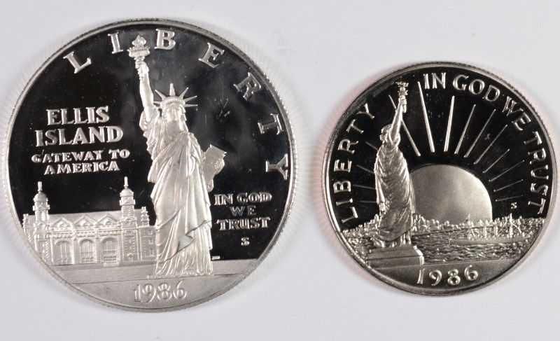 1986 STATUE OF LIBERTY PROOF SILVER DOLLAR AND CLAD HALF DOLLAR, COINS ONLY