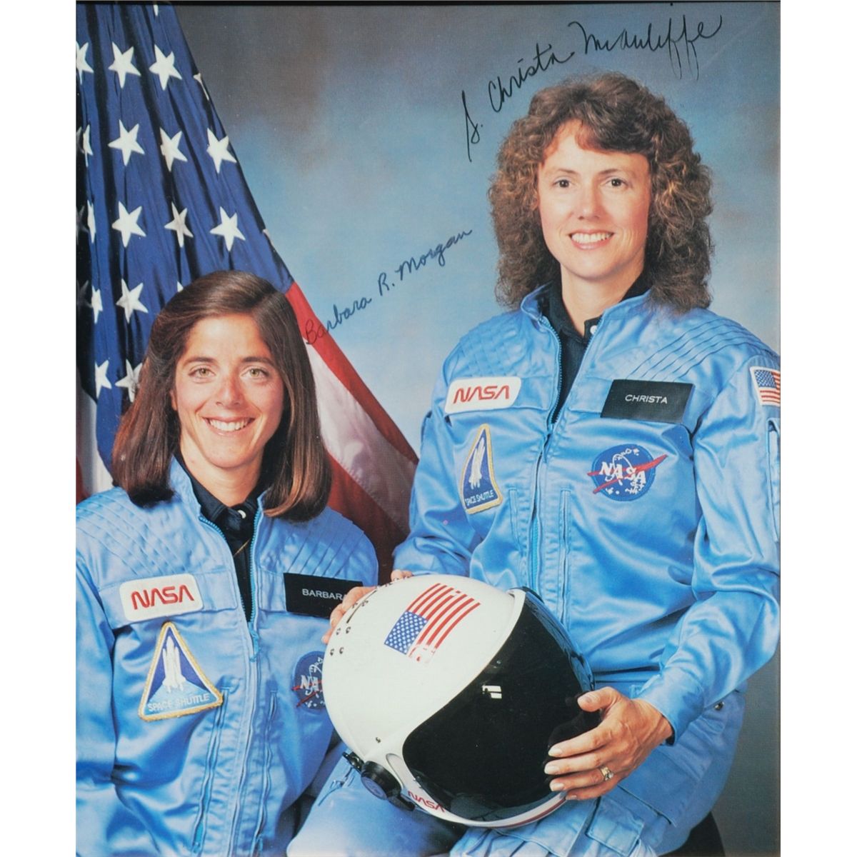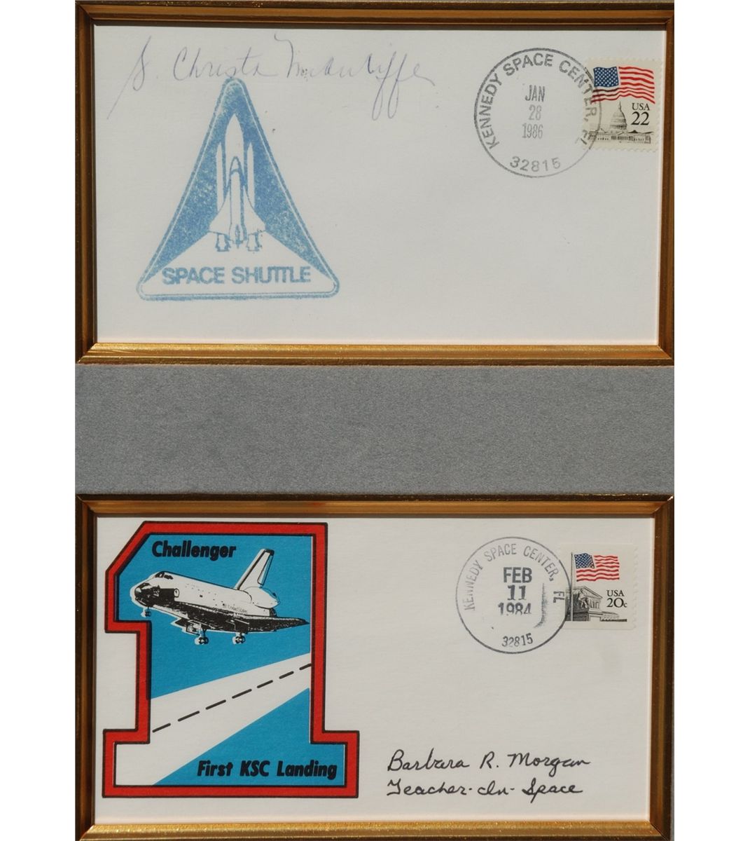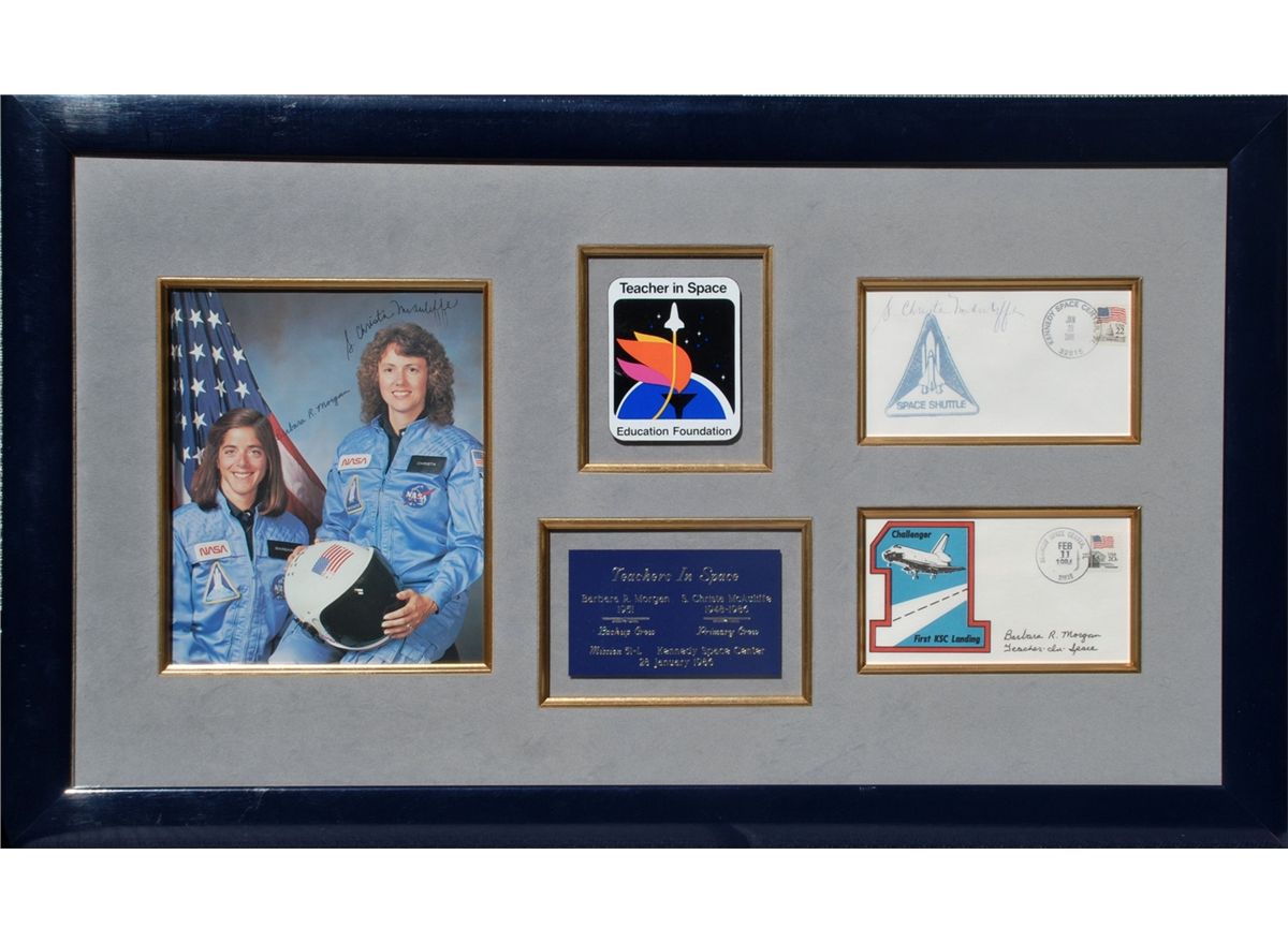 Signed on 2 separate covers and together on one 8"x10" color lithograph professionally matted and framed in blue, gold and grey (overall dimensions about 17½"x30") with gold on blue engraved annotation. Museum quality presentation of "Teacher in Space" (both McAuliffe & Morgan participated, Morgan flew on STS-118) is rare and worthy of inclusion in finest of exhibits on space, women or education. Originally sold in Superior June 1994 auction for $5,750, item has to have appreciated. Very fine.