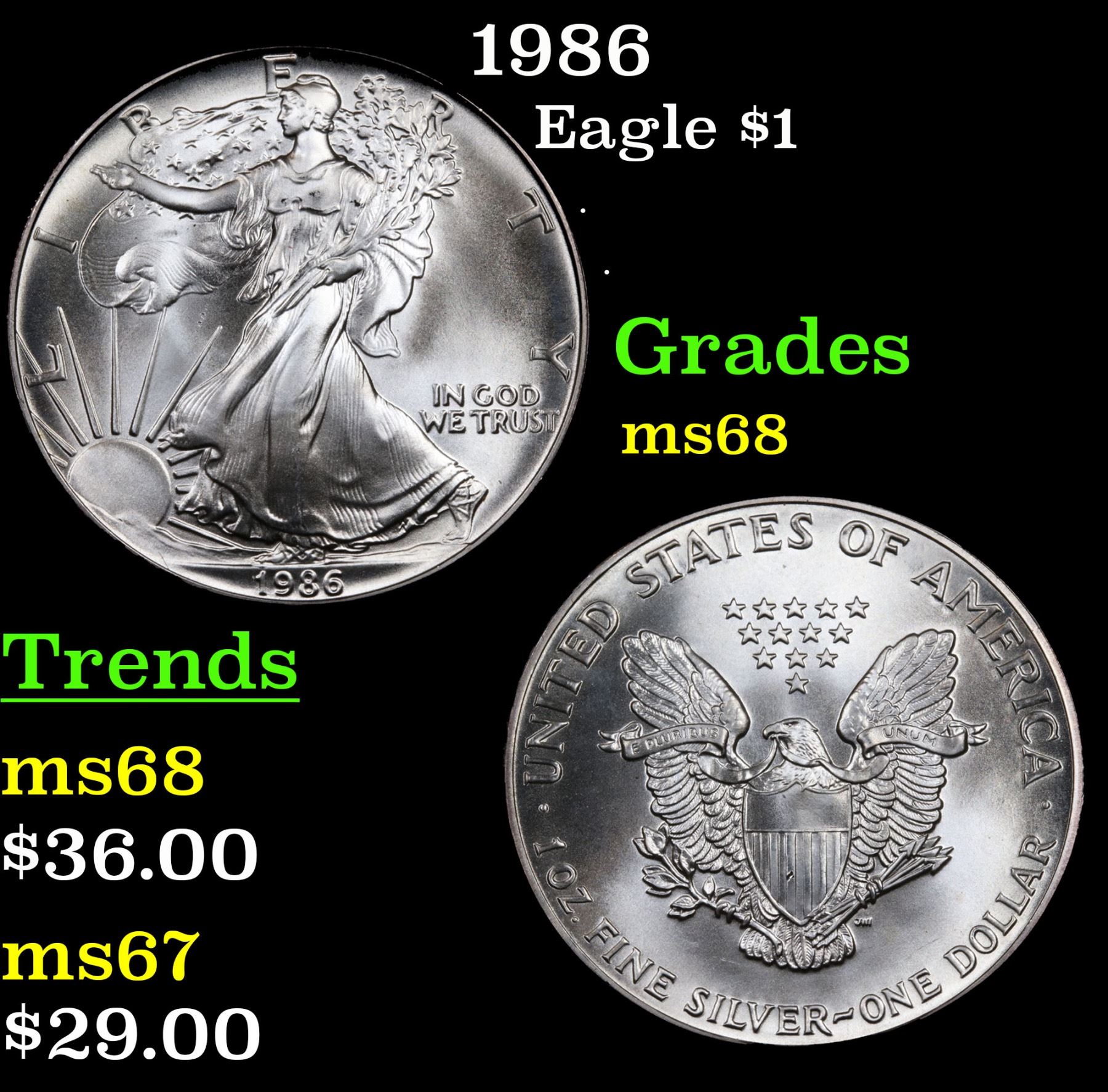 1986 Silver Eagle Dollar $1 Grades GEM+++ Unc.