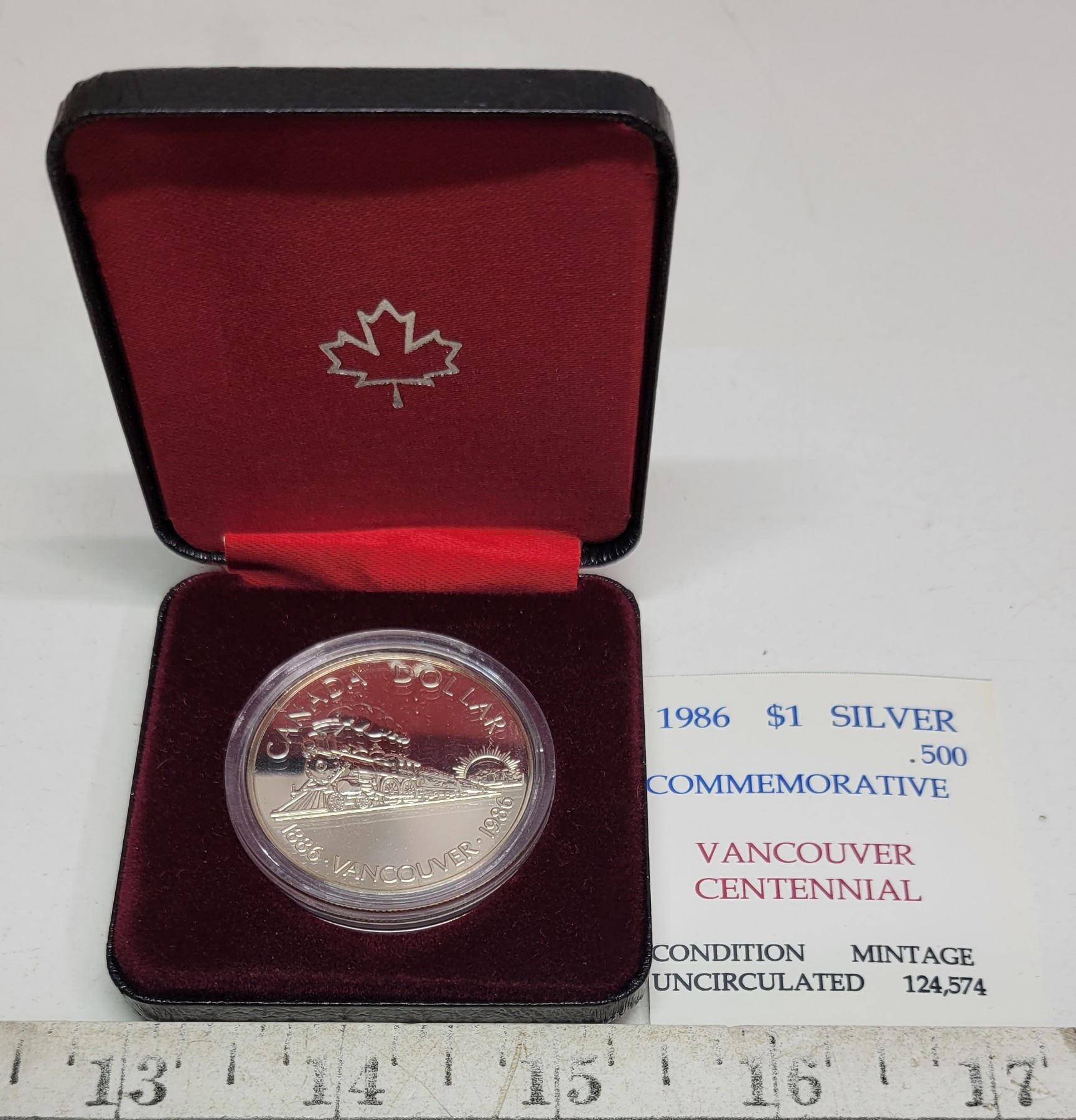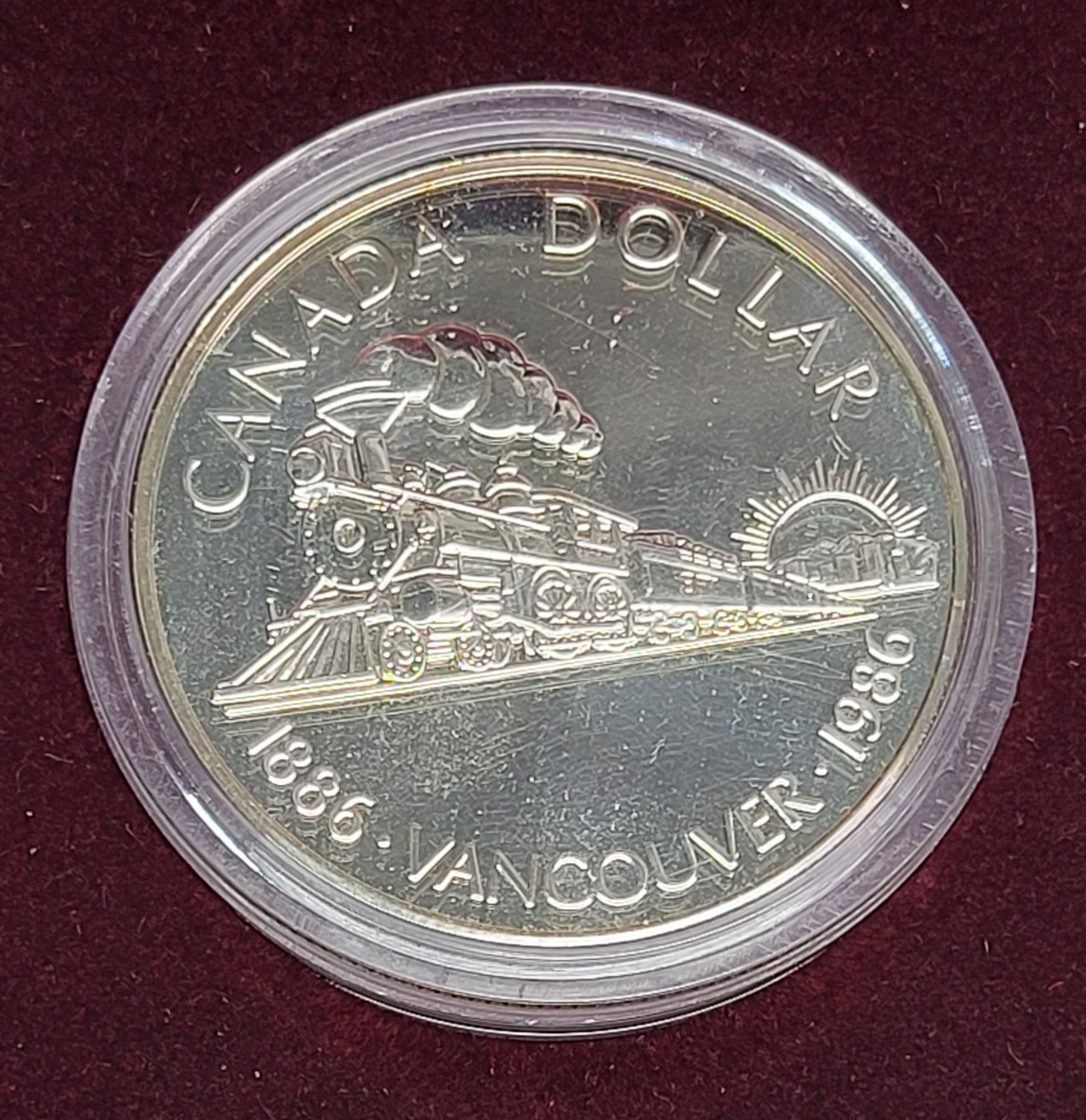 1986 Specimen Silver Dollar. 100th Anniversary of the CPR and founding of Vancouver. Housed in a black case.