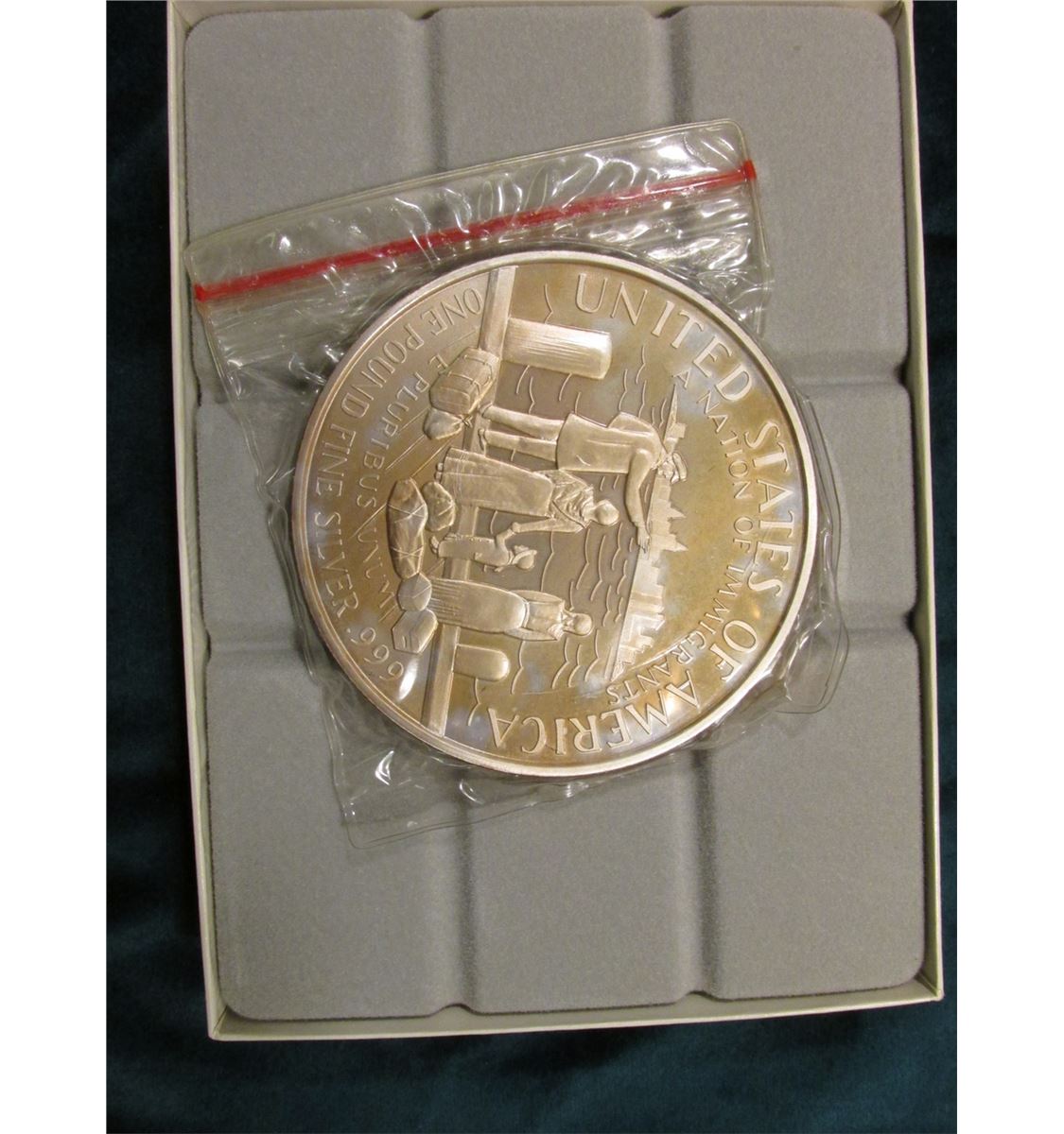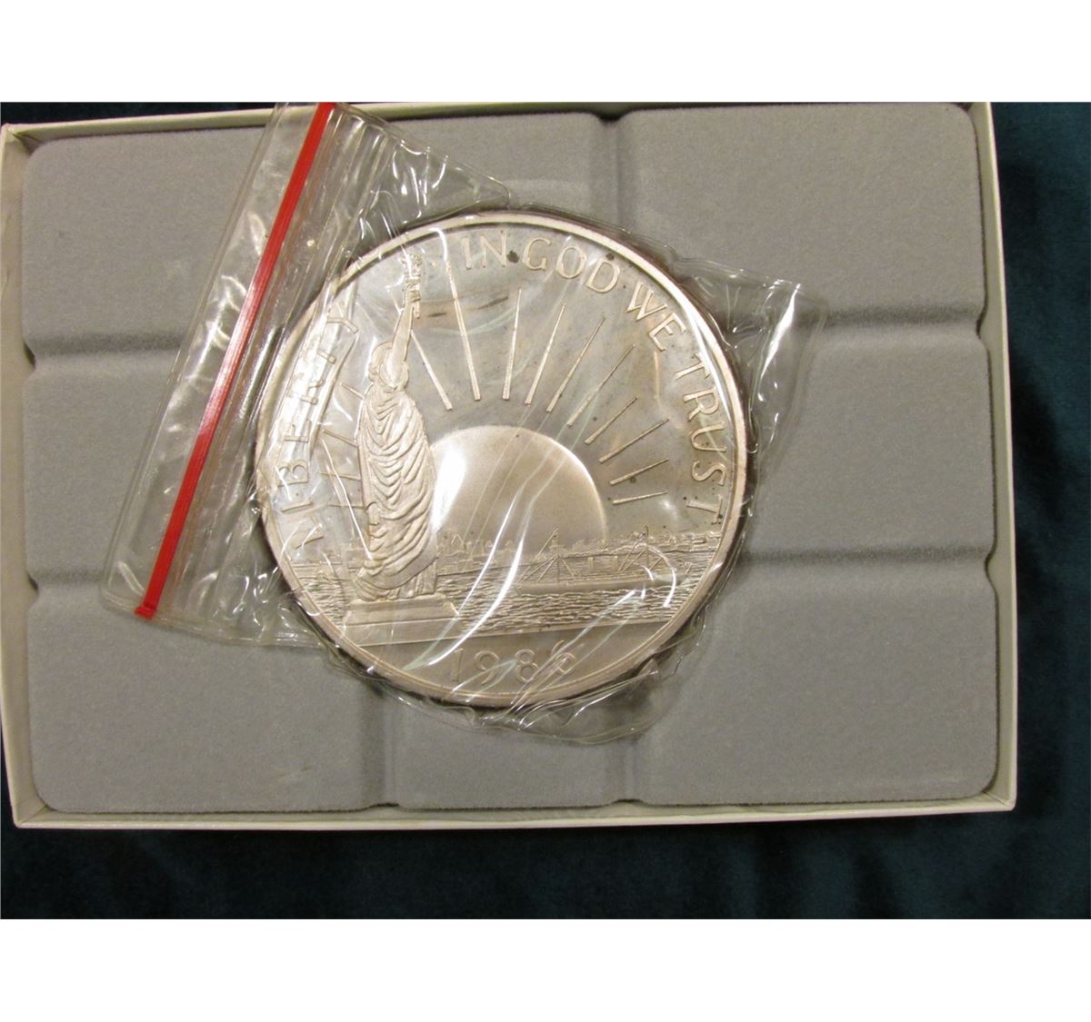 1986 Statue of Liberty "One Pound Fine Silver .999", In original felt-lined box of issue.
