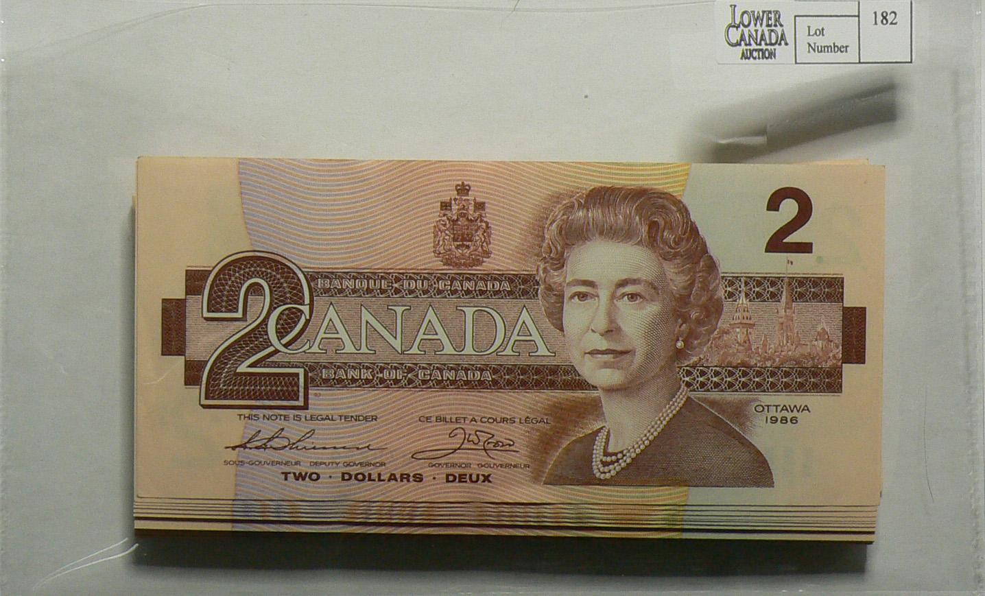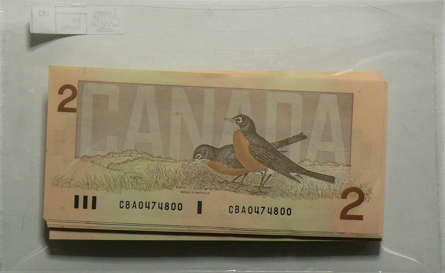 1986 Two Dollars Bundle, BC-55b, UNC, Thiessen Crow, serial CBA0474800 to CBA0474899. Lot of 100