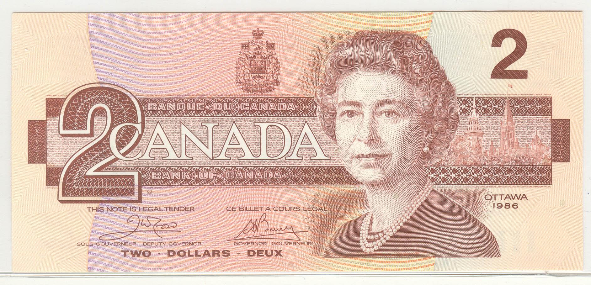 1986 Two Dollars Mixed Prefix, BC-55a, UNC, Crow Bouey, serial AUJ0614768.