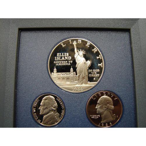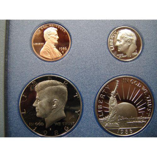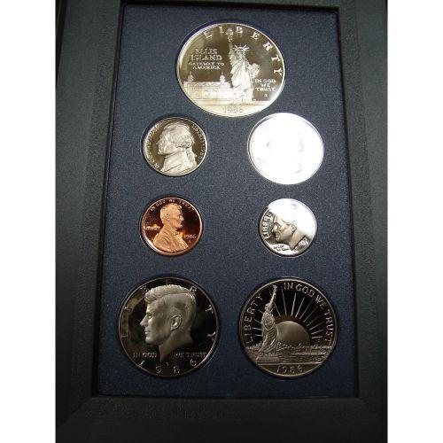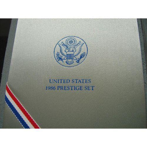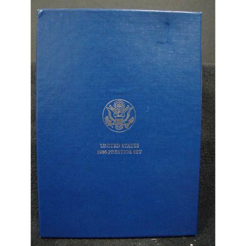 1986 U.S. PRESTIGE SET. Consists of 7 coins. Consists of Liberty silver dollar, Liberty half dollar, half dollar, quarter, dime, nickel, & cent. In case with box.
