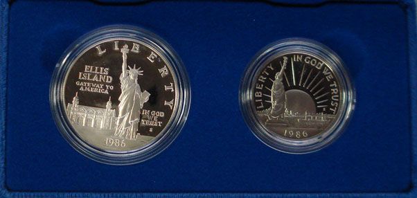 CONTAINS A 1986 STATUE OF LIBERTY SILVER DOLLAR AND A 1986 STATUE OF LIBERTY CLAD HALF DOLLAR IN ORIGINAL MINT PACKAGING, EST. $45.00 TO $50.00