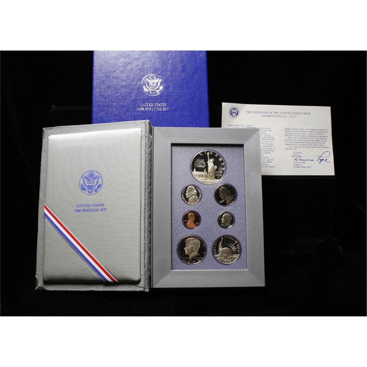 Contains the 1986 Statue of Liberty 90% silver US Silver Dollar & the 1986 Statue of Liberty Half Dollar plus the Traditional 5 pieces 1986 Proof Set. Includes all the original packaging and the COA. Note* The silver Dollar alone has .7736 Oz. of pure silver. Estimated Value $90