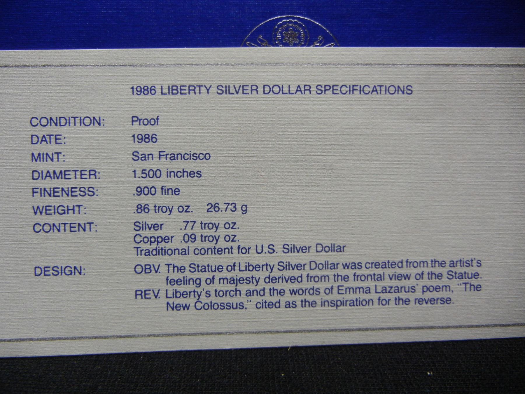 1986 United States Statue of Liberty Proof Silver Dollar in Original Packaging