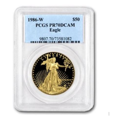 Year:1986: Grade: PR-70 PCGS : DENO:50W - West Point: Metal Cont.: 1 Troy oz. : Purity & Manufacturer: 0.9167U.S. Mint