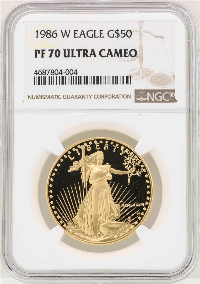One 1986-W $50 American Gold Eagle Coin NGC PF70 Ultra Cameo. NGC Certified.