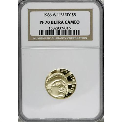 <B>1986-W G$5 Statue of Liberty Gold Five Dollar PR70 Deep Cameo NGC; 1987-W Constitution Gold Five Dollar PR70 Deep Cameo NGC; 1988-W Olympic Gold Five Dollar PR70 Deep Cameo NGC </B></I>and a<B> 1989-W Congress Gold Five Dollar PR70 Deep Cameo NGC.</B></I><BR><BR><b>Shipping:</b> Coins & Currency (<a target="_blank" href="http://www.heritageauctions.com/common/shipping.php">view shipping information</a>)