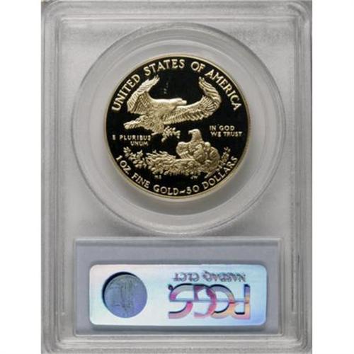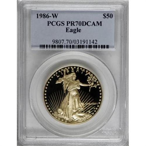 <B>1986-W G$50 One-Ounce Gold Eagle PR70 Deep Cameo PCGS.</B></I> A gleaming, perfect proof from the premiere issue of American Eagles. Both sides show strong mirrors and rich frost, though the obverse offers a greater degree of contrast. One of 96 specimens so graded by PCGS (8/07).<BR><BR><b>Shipping:</b> Coins & Currency (<a target="_blank" href="http://www.heritageauctions.com/common/shipping.php">view shipping information</a>)