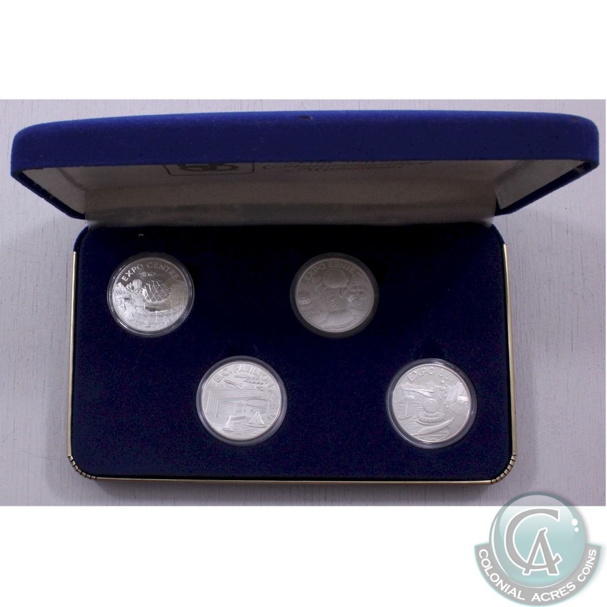 1986 World Exposition Official 4-Medallion .999 Fine Silver Set issued in Vancouver, Canada (Tax Exempt). The medallions you will receive are the: Expo Centre (toned), Expo Ernie, Expo 86 and B.C Pavilion. Coins come encapsulated in a blue display case.