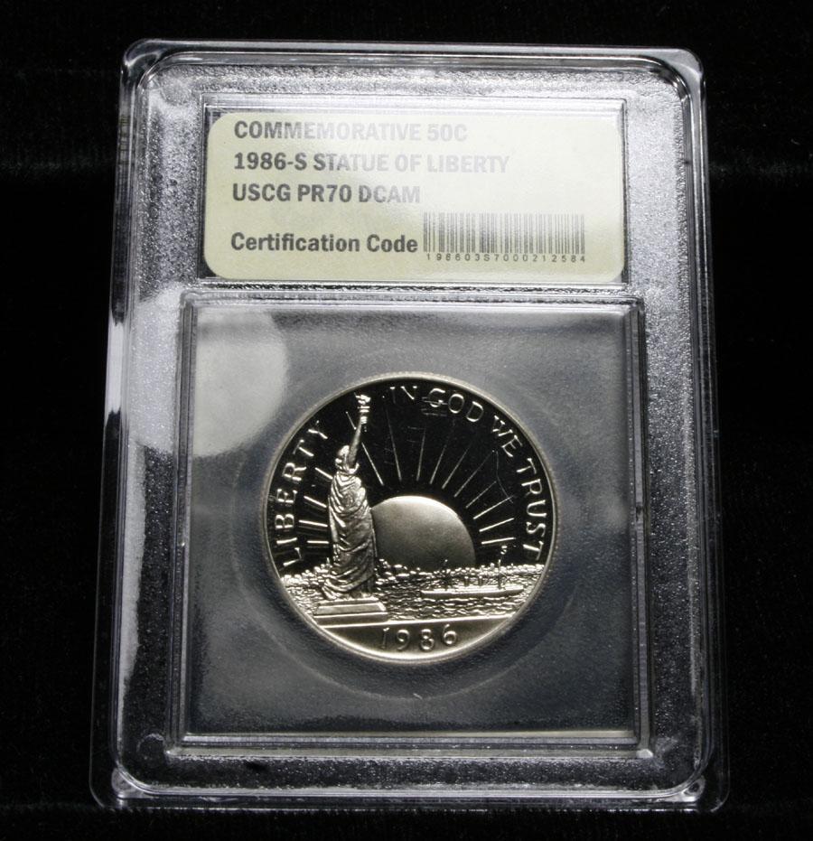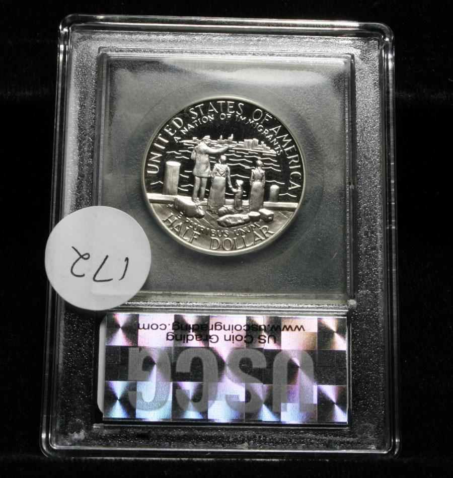 This Statue of Liberty commemorative which pays homage to Ellis Island. PCGS lists PR70 DCAM at $700. This example is Graded PR70 DCAM by USCG. Estimated Value $150.