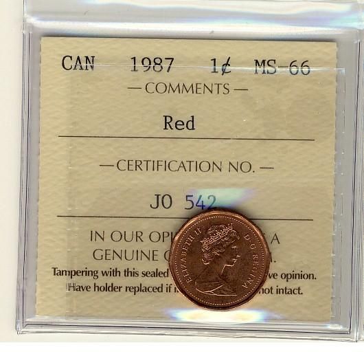 1987 1¢ ICCS MS66 Full Red, A superb GEM example.