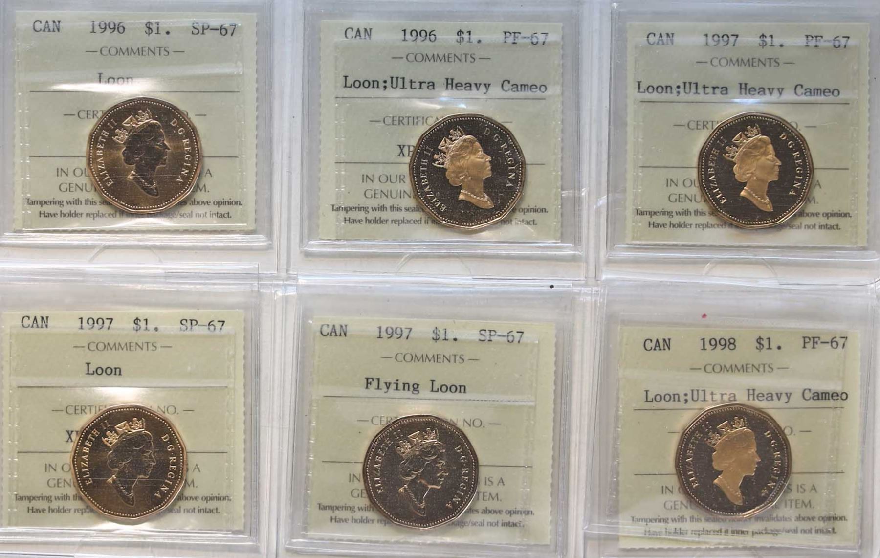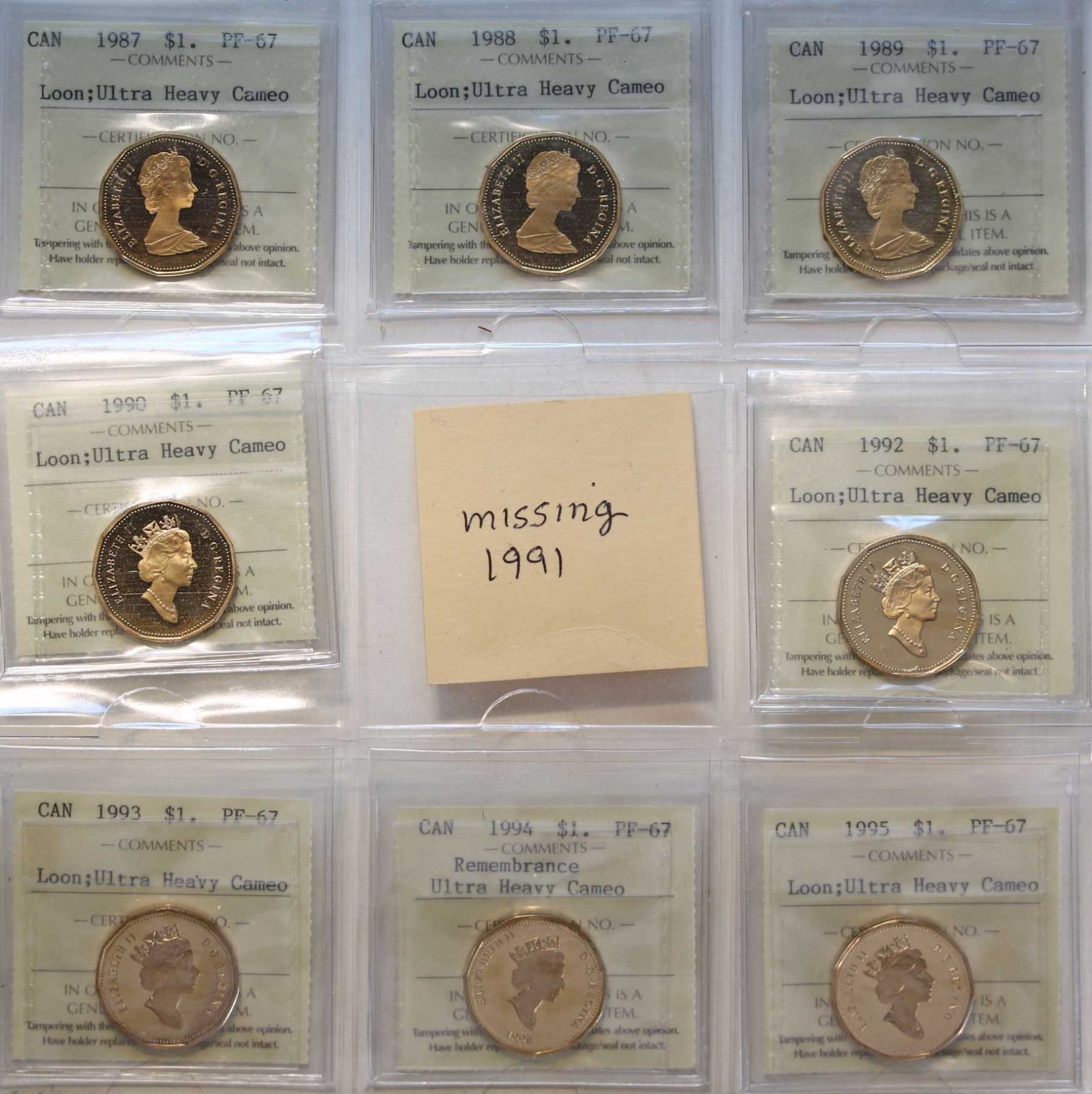 1987 $1 Loon Type to 1998. Lot of 14 coins all ICCS graded Superb Gem SPECIMEN-67 to PF67 many with Ultra Heavy Cameo Designations.