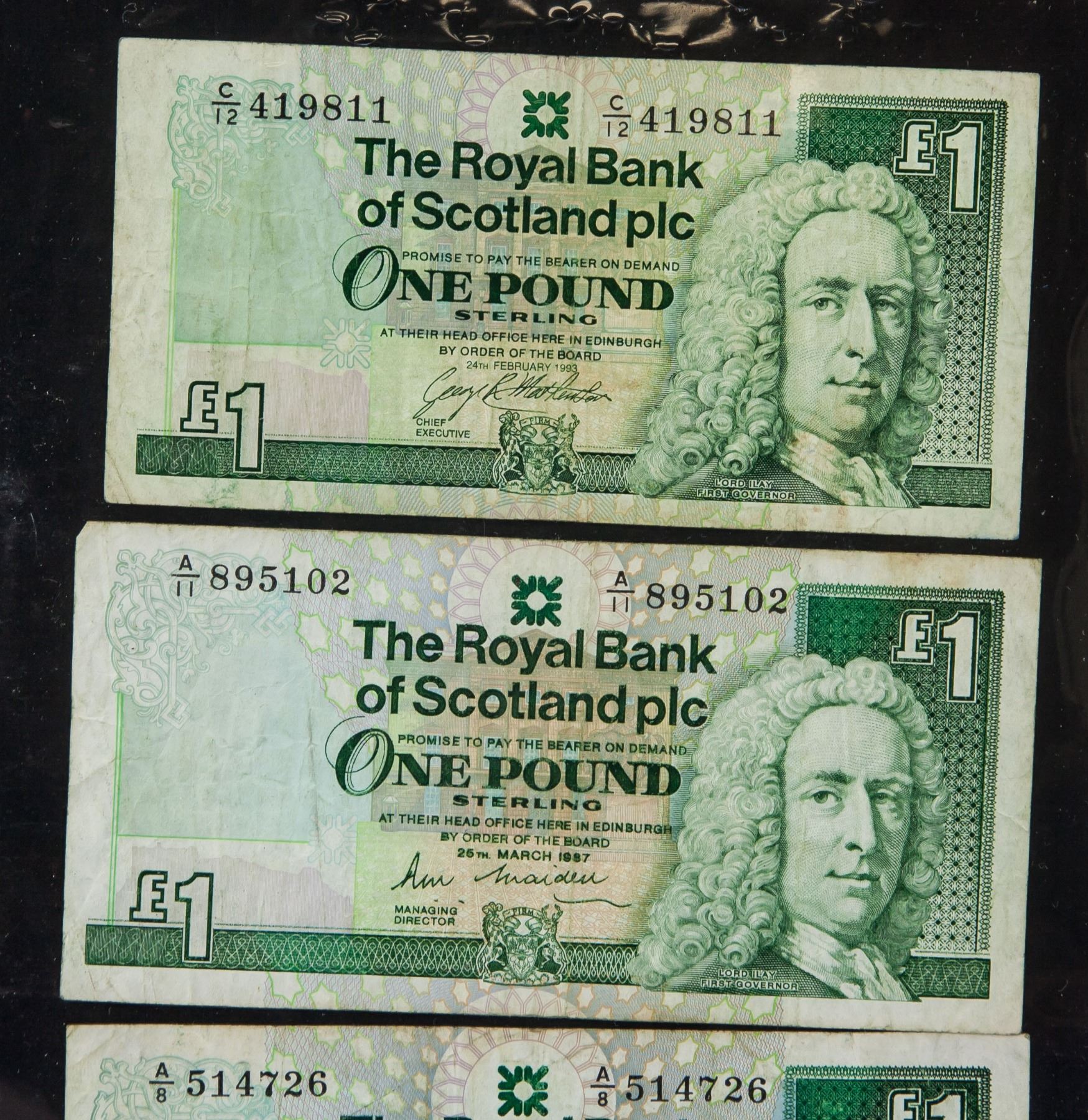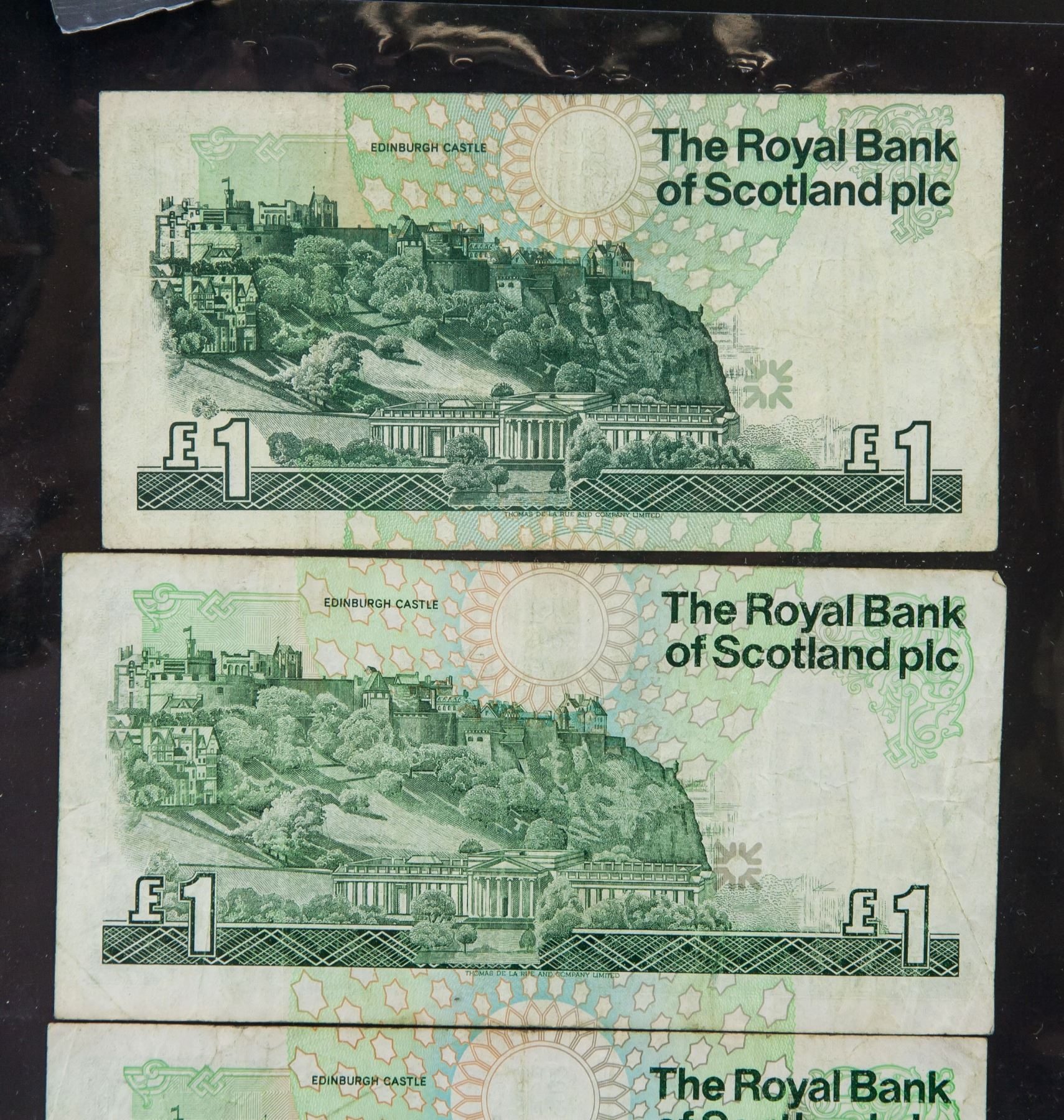 Three of the Royal Bank of Scotland £1 notes. First issued in 1987, each has different series number. Designed by Lord Ilay in 1987, 6.5 x 12.8 cm. PROVENANCE: Private collection (Alberta, ON)