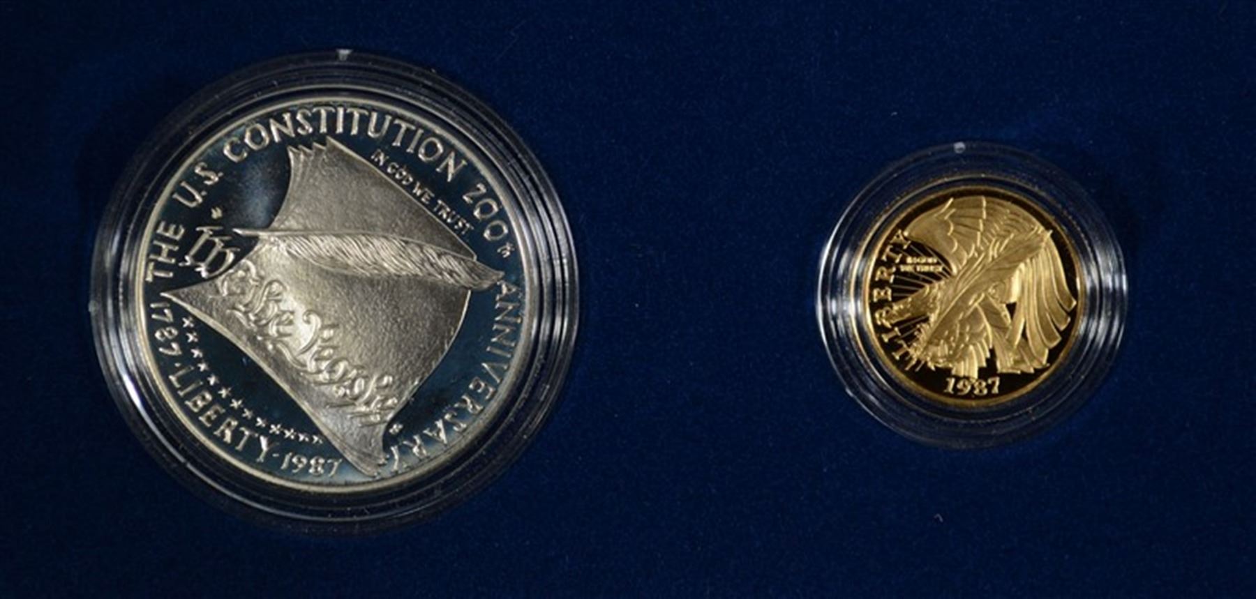 SILVER DOLLAR & $5.00 GOLD IN ORIGINAL PACKAGING ESTIMATE $400 - $450.