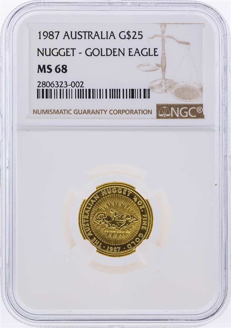 One 1987 $25 Australian Nugget Golden Eagle Coin NGC MS68. NGC Certified.