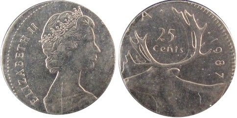 1987 25¢ ERROR CCCS MS60. 2,1gr struck on a 10¢ planchet.