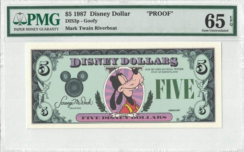 One 1987 $5 Goofy Proof Disney Dollar PMG 65EPQ.