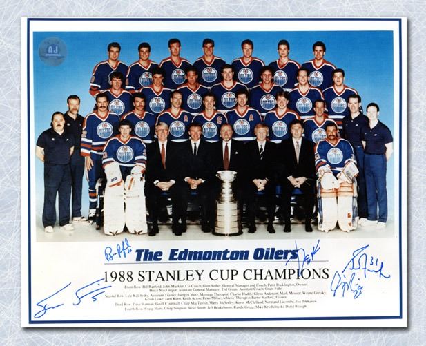 1987-88 Edmonton Oilers Team Signed Stanley Cup 8x10 Photo 5 Autographs. This Edmonton Oilers 8x10 Photo has been hand signed by Grant Fuhr, Bill Ranford, Craig Muni, Jari Kurri, and Steve Smith. A.J. Sports World guarantees this autograph with a Certificate of Authenticity and tamper resistant hologram from A.J. Sports World.
