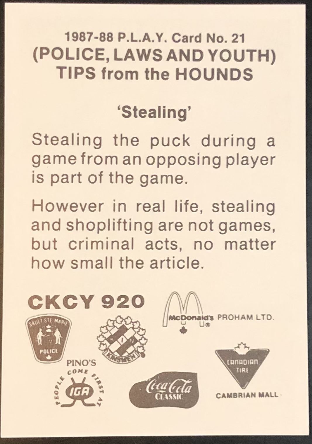 Set issued by Sault Ste. Marie Regional Police, card #21 CHL, OHL, vintage, hockey, rookie, regional