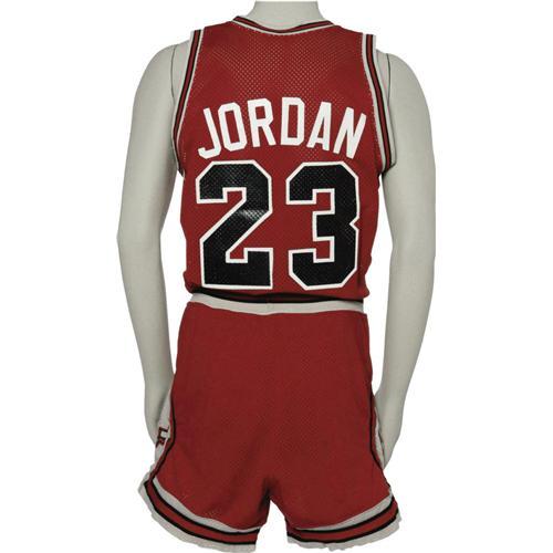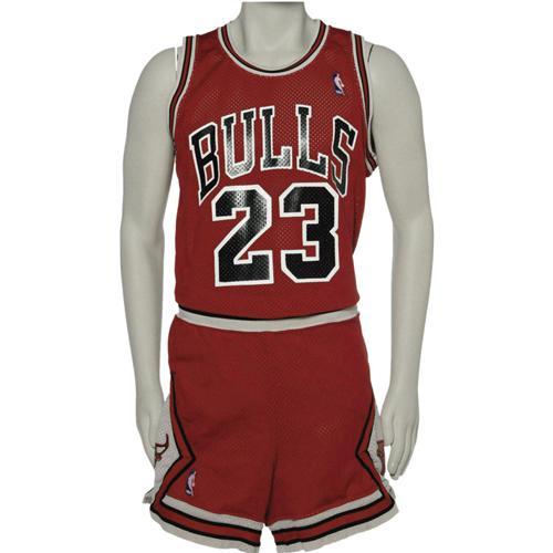 <B>1987-88 Michael Jordan Game Worn Uniform.</B></I> The 1987-1988 season was a defining one for Michael Jordan. His first three years in the league saw him ascend to the cusp of N.B.A. royalty, but there were some who still regarded him strictly as an electrifying player who put more stock in the number of points he scored rather than the number of games his team won. Michael changed quite a few minds in 87-88, leading the Bulls to a 50-32 record, and getting them out of Round One of the playoffs for the first time since his arrival in Chicago. His performance in the first round of the playoffs against Cleveland, where he averaged forty-five points per game, is the stuff of which legends are made.<BR><BR> Like a great film at the Oscars, when it came to award time, Jordan swept all categories. First team All-N.B.A. for a second consecutive year, League Most Valuable Player, and Defensive Player of the Year. The All-Star Game was held in front of his hometown Chicago fans that year, and he did not disappoint, walking away with M.V.P. honors and, of course, retaining his title as Slam Dunk Champion, with the famous leap from the free throw line which is the source of one of the most famous basketball images ever. Jordan was wearing his road jersey during the dunk contest, and for all we know, this was the one he had on. It was one of the most remarkable seasons in N.B.A. history, and judging by the use on this complete uniform, Michael worked very hard for the accolades he received that year.<BR><BR> This complete Chicago Bulls road uniform show as much wear as we have ever seen on a modern basketball jersey, clearly having seen hundreds of minutes of floor time during its tenure in Mike's wardrobe. The uniform was so saturated by the sweat of hardwood royalty that some of the white areas of the jersey are stained to a light gray. The supremely memorable number "23" is screened in bold black and white on chest and verso, where the words "Bulls" and "Jordan" are announced respectively. The jersey and shorts are properly tagged with "Sand-Knit 44 Bulls Exclusivity" labels, with the "3" L.B." alteration noted on an embroidered swatch to the left. The matching shorts have similar "Sand-Knit Bulls Exclusivity" labeling, with Jordan's sweat-smeared number "23" in marker on the size "36" tag.<BR><BR> The provenance on the uniform is impeccable, with a letter from then Bulls V.P. of Basketball Operations Billy McKinney to our consignor letting him know his extraordinary request for a Jordan jersey had finally been met, and with the shorts to boot. While Jordan uniforms from his later years with the Bulls are not terribly difficult to obtain, early gamers do not come along very often. The Jordan collector that passes on this jersey may end up feeling like the Trailblazers G.M. who passed on Jordan in the draft. <I>LOA from SCD Authentic & Lou Lampson.</B></I> <BR><BR><B>Important notice:</B> Heritage usually auctions material at the rate of 200-250 lots per hour. On some occasions eBay Live bid software or the Internet may not be able to keep up with the pace of the auction. We recommend placing a realistic absentee bid now as insurance to avoid disappointment. Occasionally the auctioneer may eliminate or reject an eBay Live bid, and the auctioneer may also reopen a lot after the close of the eBay live bidding (usually because we missed an audience bid), and may reject your bid even if it shows you as the winning bidder. By bidding via eBay Live, you agree that Heritage may award the lot to another bidder at its sole discretion under the circumstances described above or any other reasonable circumstances. Since eBay bids are not shown to us until we open the lot on the floor, we treat those bids just like floor bids. In most cases the floor responds before the eBay bid is presented to us, due to Internet lag time, so for consistency we have made it a policy that floor bids are always considered first over tie eBay live bids. Also please note that all Heritage lots purchased through eBay Live carry a 22.5% Buyer's Premium. Please make sure you read the Terms and Conditions before you bid. This lot is being auctioned in conjunction with a live floor auction by Heritage Galleries & Auctioneers. All final auction and invoice information will be supplied by Heritage Galleries & Auctioneers, and all other information should be considered preliminary. Lot:19225 <BR><BR><B>Winning Notification and Billing:</B> After the FINAL session in this auction is complete, Heritage will send e-mail and snail mail invoices. This process normally takes several days. All final auction and invoice information will be supplied by Heritage Galleries & Auctioneers, and all other information should be considered preliminary. <BR><BR>This auction will be conducted on a live auction floor and over the Internet through eBay Live. If you choose to place an absentee bid, please take a moment to <font color='#0000ff'><u><a href='http://pages.ebay.com/liveauctions/help/before/laabsentee.html'>learn how eBay Live absentee bidding works</a></u></font><font color='#000000'>
