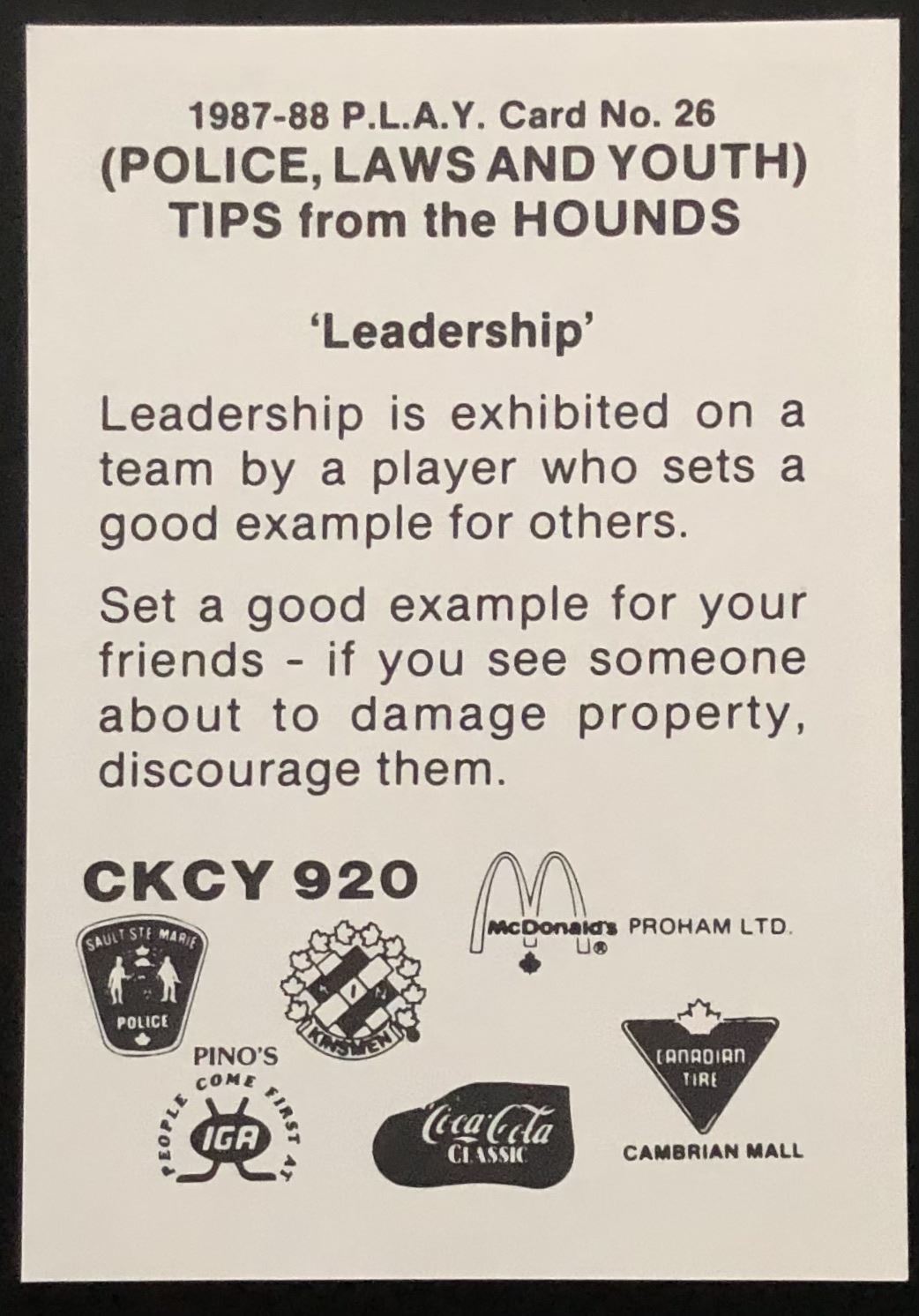 Soo Greyhounds card #26 , PLAY (Police, Law & Youth) set issued by Sault Ste. Marie Regional Police Dept OHL, CHL, vintage, hockey, rookie, regional