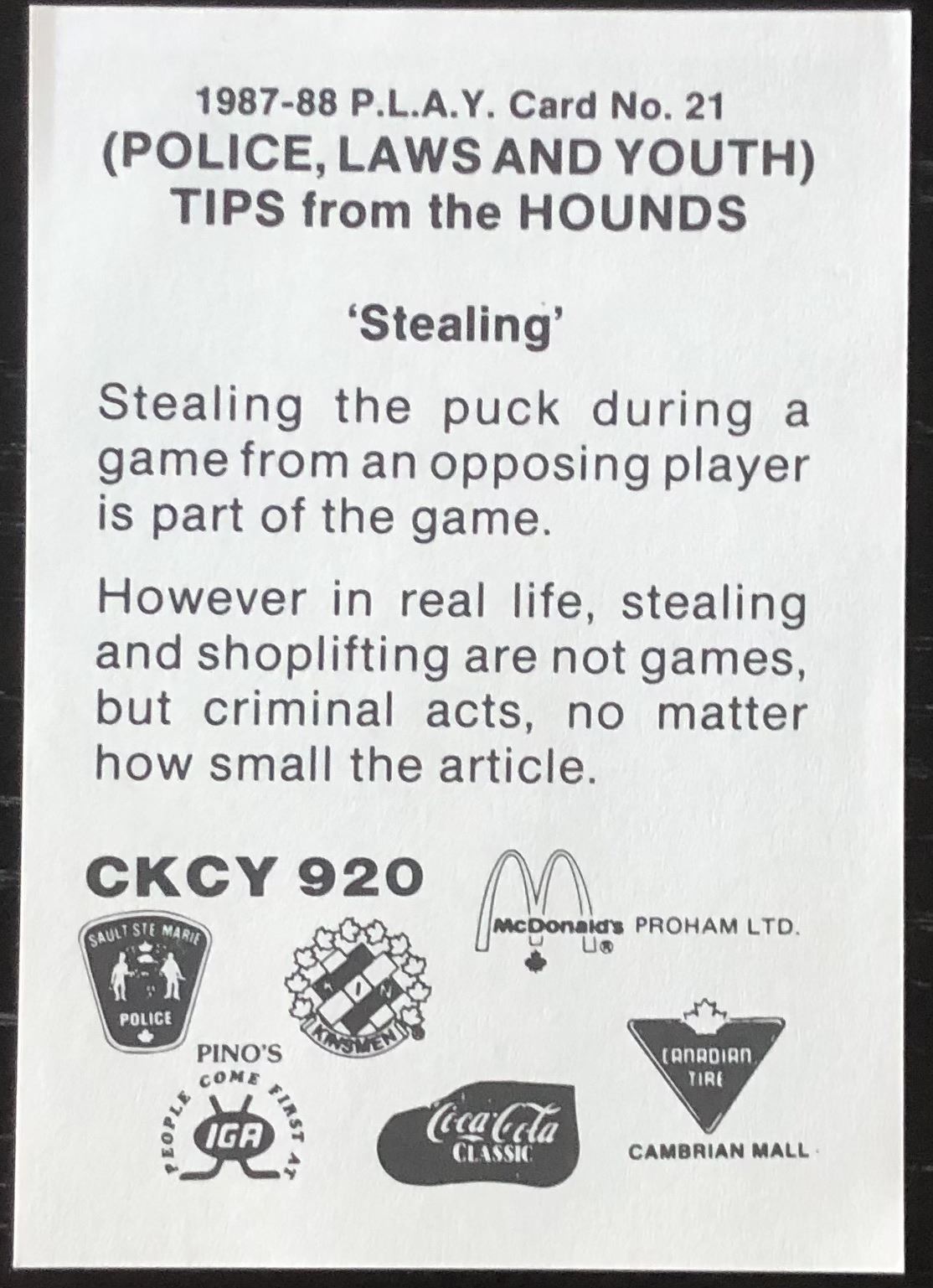 Team set issued by Sault Ste. Marie (ON) Police, card #21 CHL, OHL, vintage, rookie