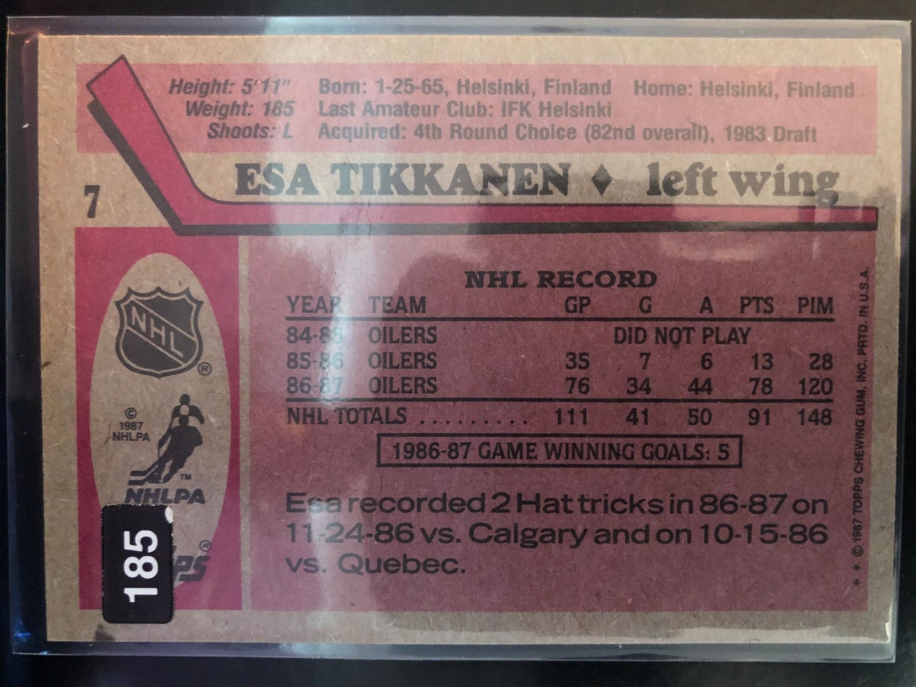 1987-88 Topps Rookie Card Esa Tikkanen Card #7