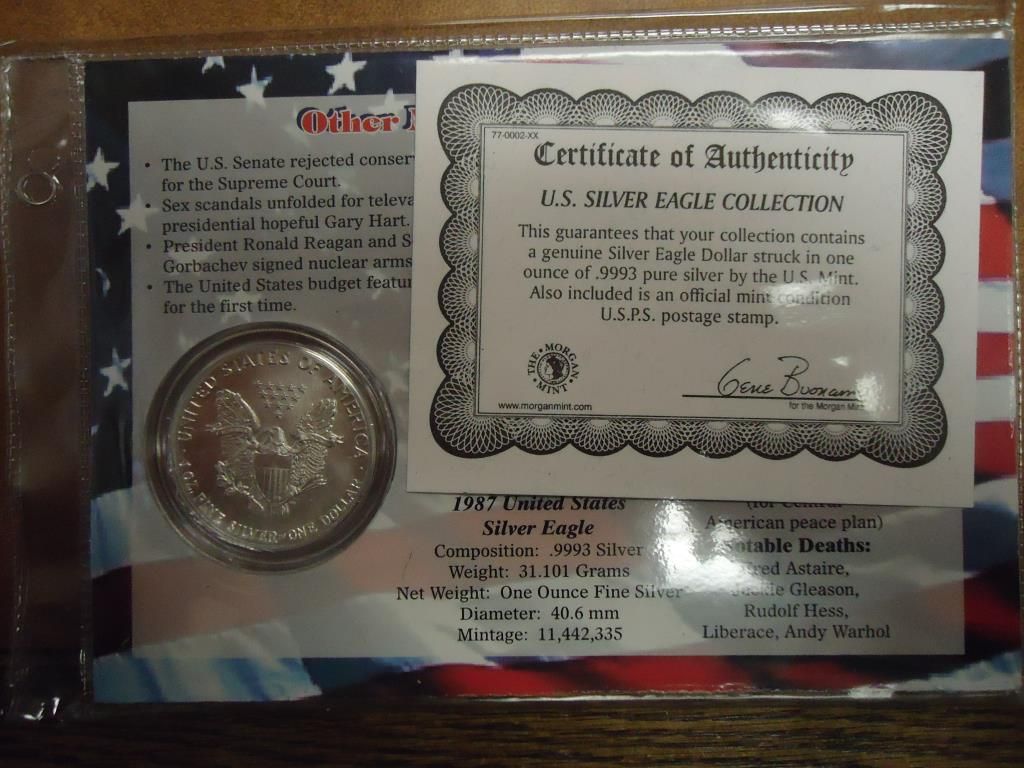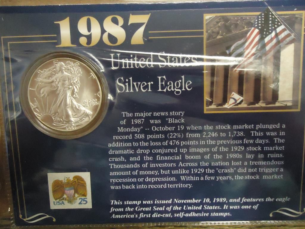 1987 AMERICAN SILVER EAGLE (UNC) AND STAMP ON CARD
