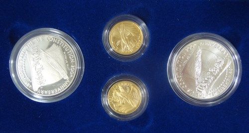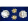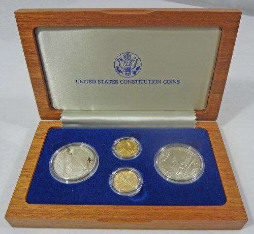 1987 PROOF AND UNC. SILVER DOLLARS AND 1987 PROOF AND UNC. $5.00 GOLD COINS, IN ORIGINAL BOX CERTIFICATE AND OUTER PACKAGING, ESTIMATE, $850.00 TO $950.00