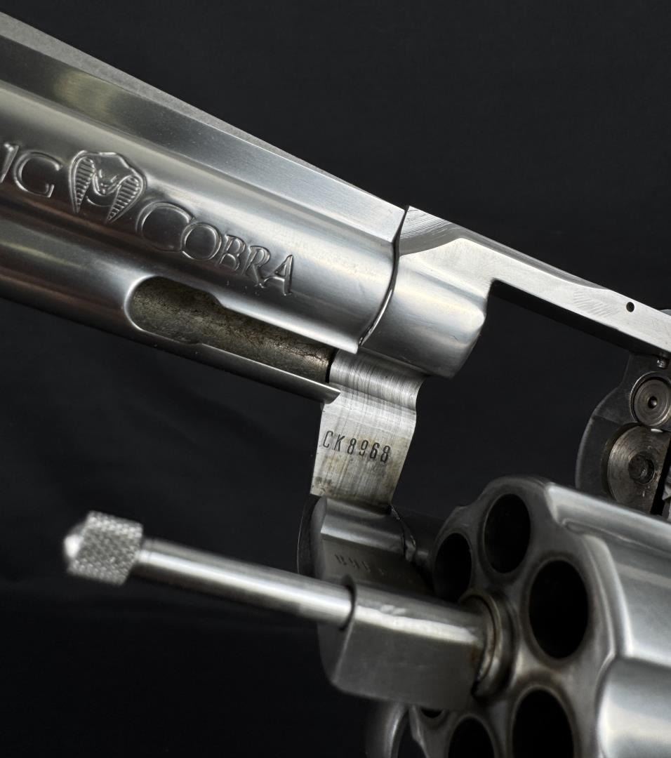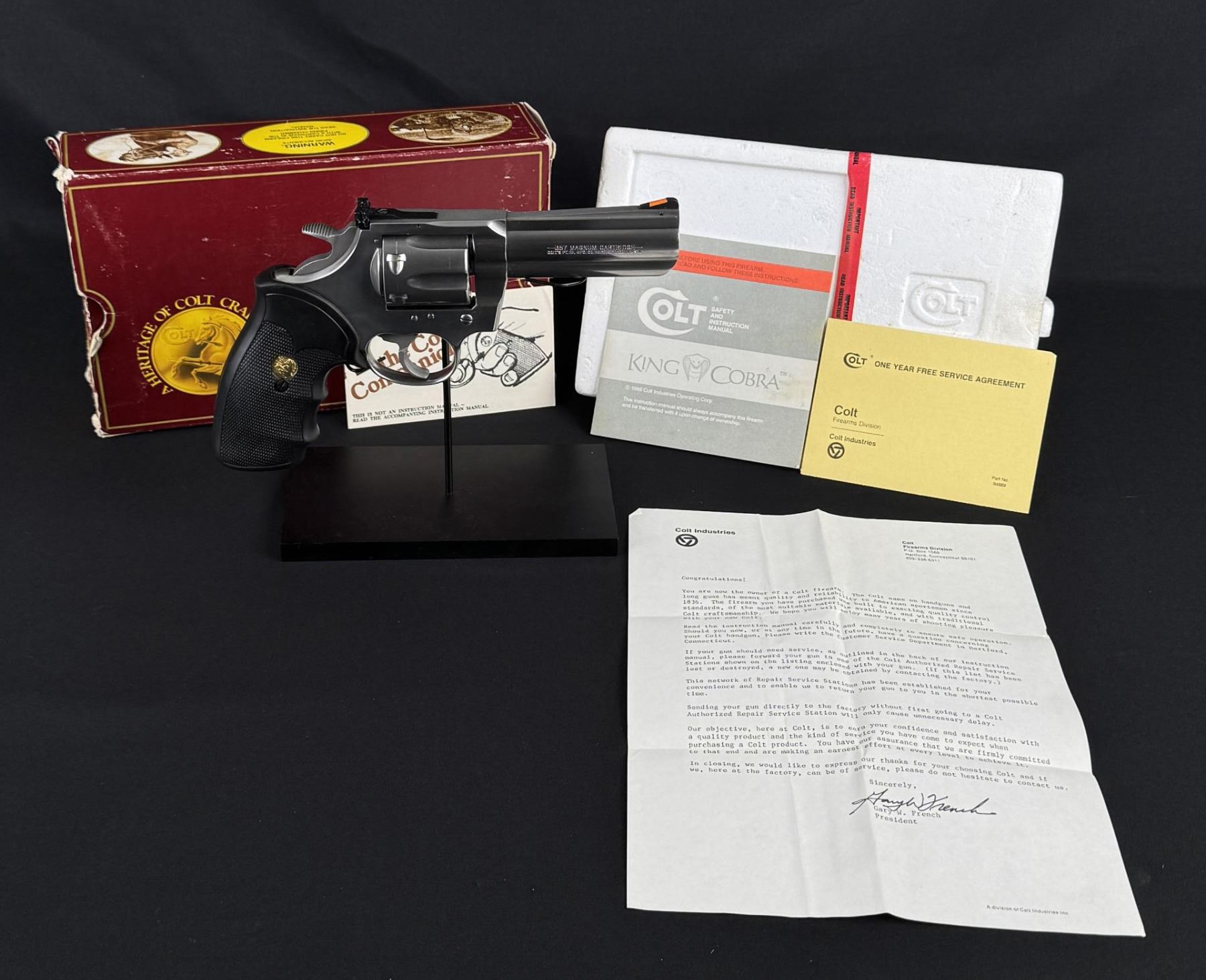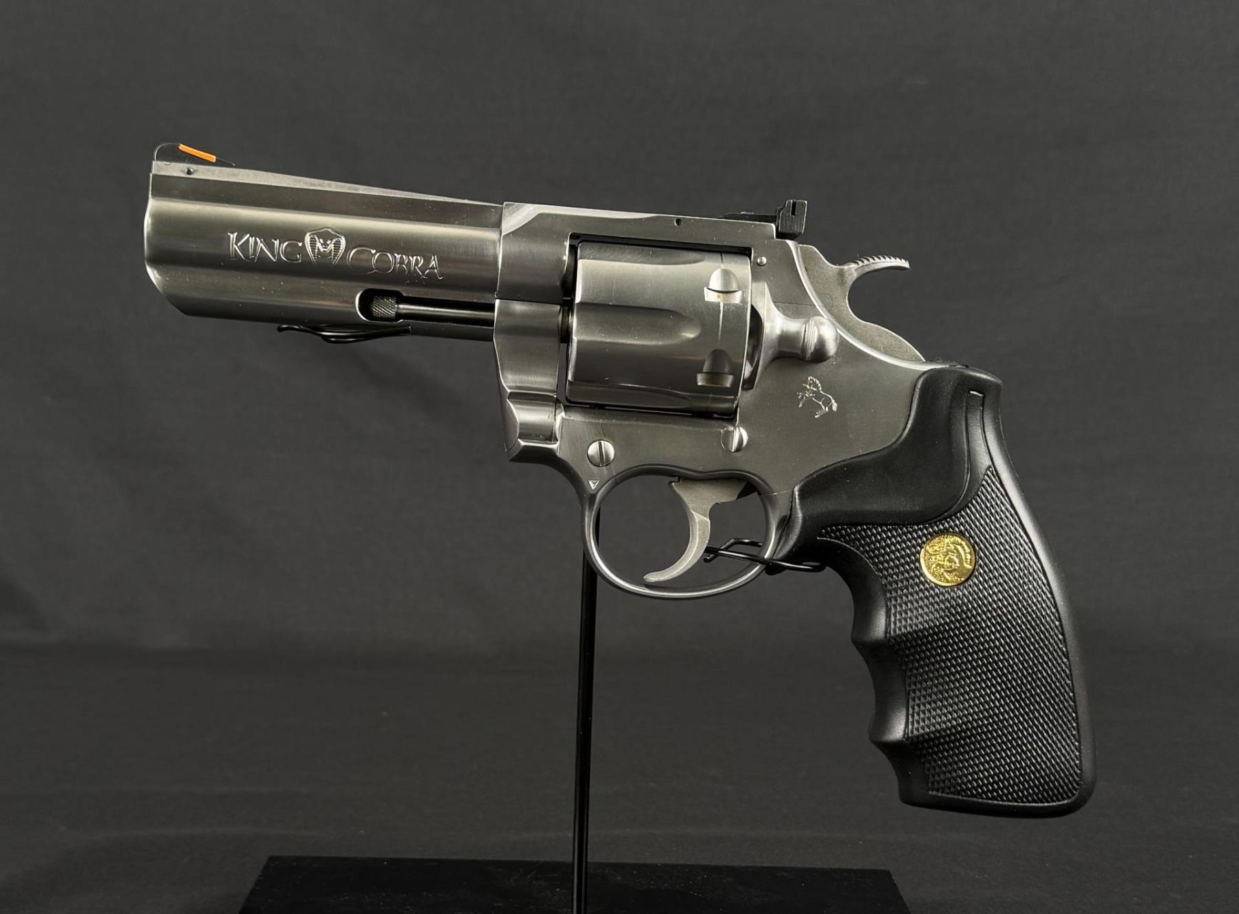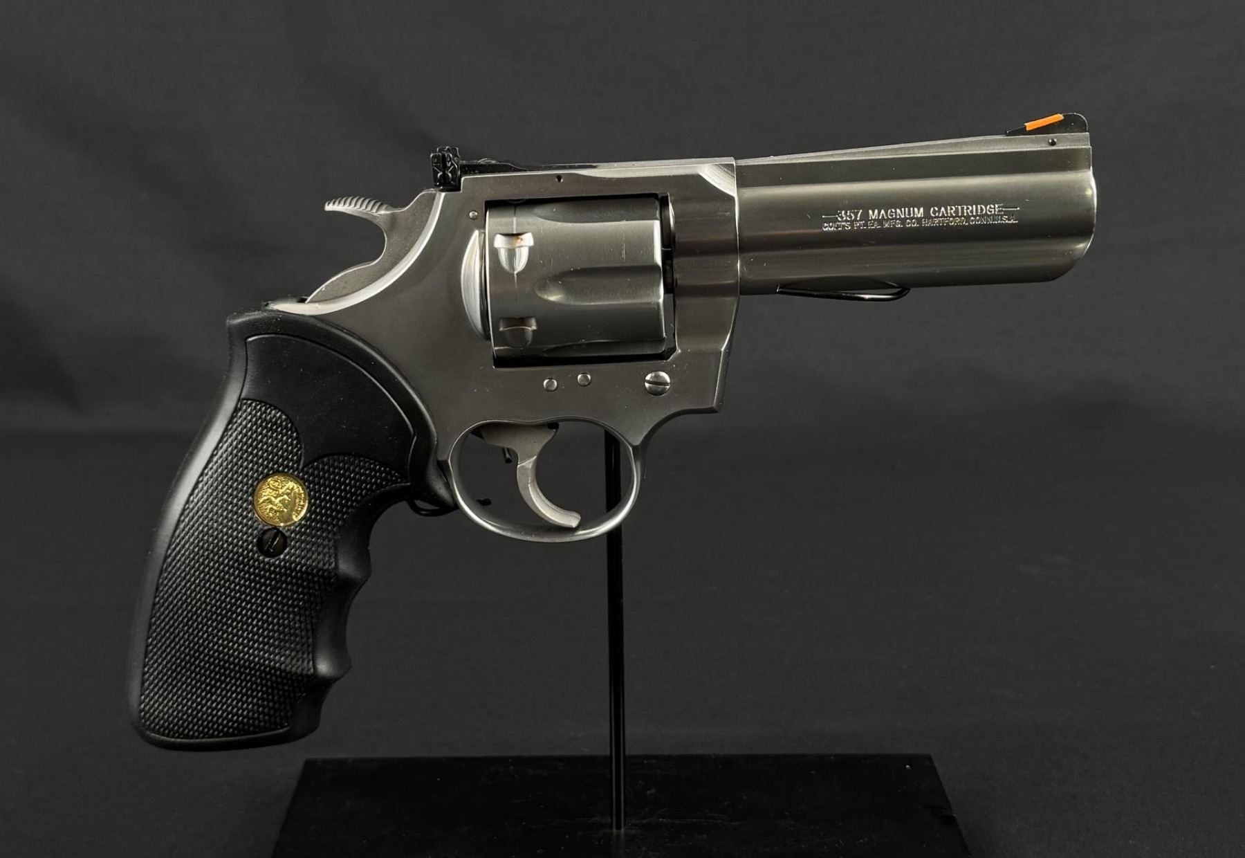 4" barrel having solid rib with blued, pinned, ramped blade front sight (orange insert). Frame mounted Colt Accro rear sight with white outlined blade. Mfg. 1987 (1986-1992) as "Snake" revolver having checkered Pachmayr for Colt finger grooved rubber grips; silver Colt medallions. Wide trigger plus large spur hammer; both serrated. Requires FFL Transfer, C&R not accepted.