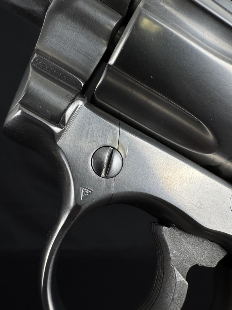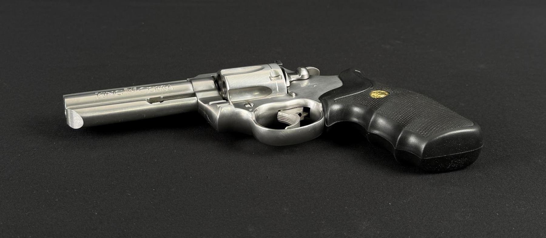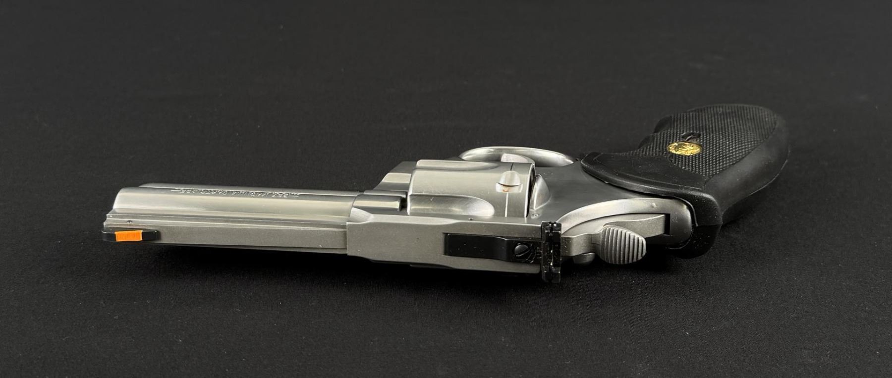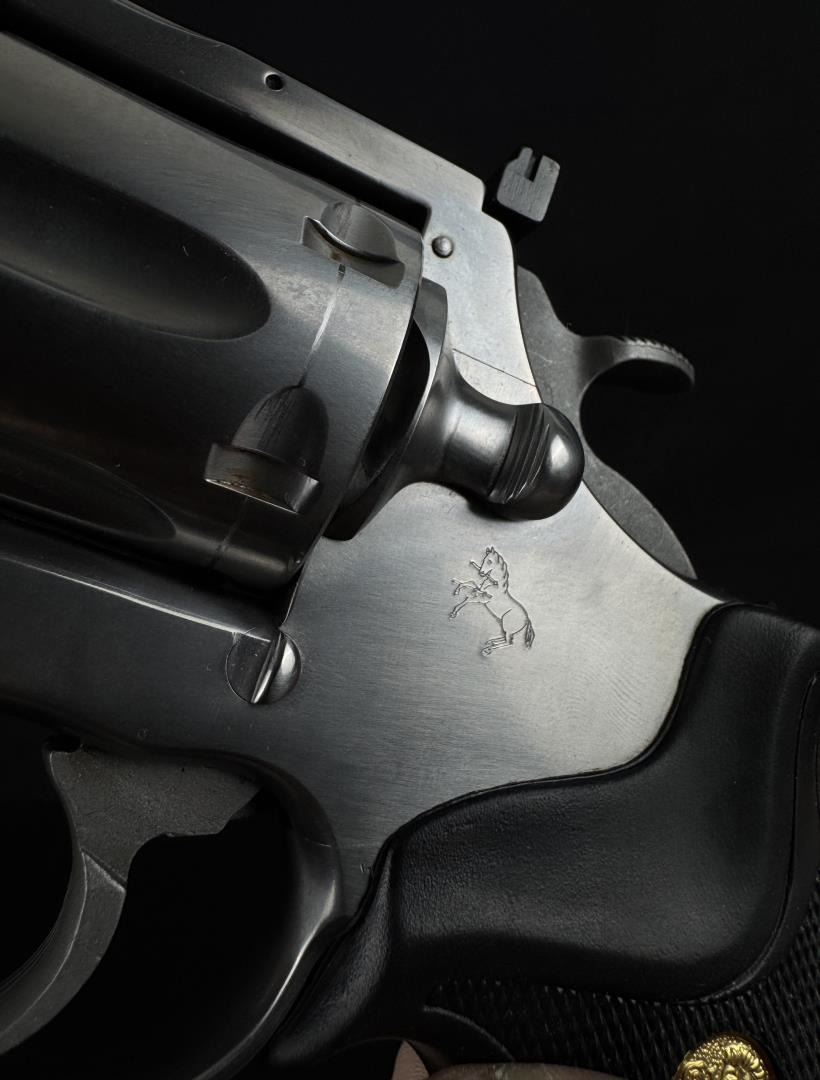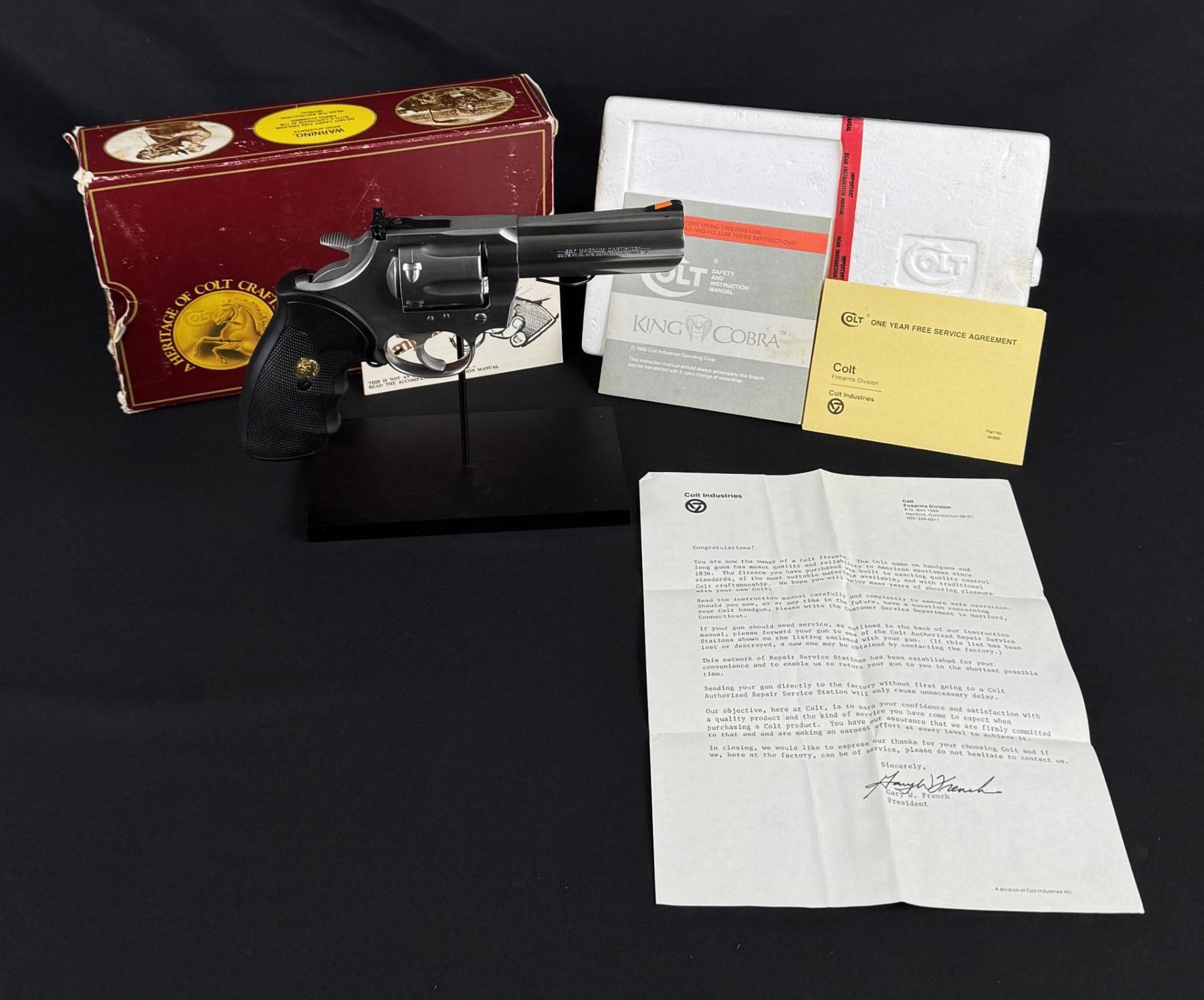 4" barrel having solid rib with blued, pinned, ramped blade front sight (orange insert). Frame mounted Colt Accro rear sight with white outlined blade. Mfg. 1987 (1986-1992) as "Snake" revolver having checkered Pachmayr for Colt finger grooved rubber grips; silver Colt medallions. Wide trigger plus large spur hammer; both serrated. Requires FFL Transfer, C&R not accepted.
