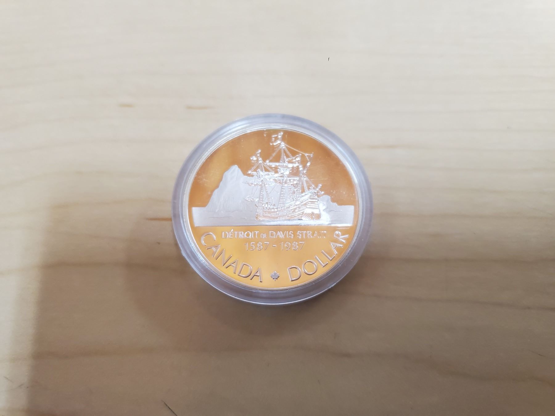 1987 Davis Strait Silver Dollar. Commemorates the 400th Anniversary of John Davis’s explorations to discover the North West Passage. Proof with Ultra Heavy Cameo. Bright White. Housed in its original hard plastic holder.