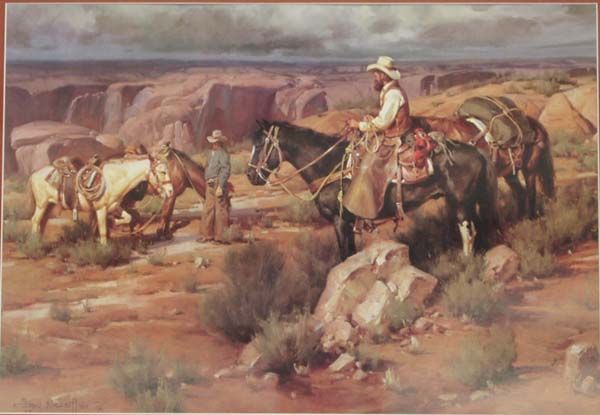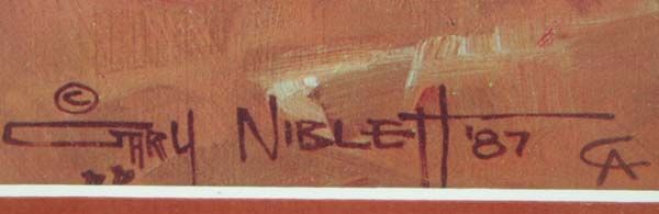 1987 Gary Niblett Print. This piece portrays Cowboys on the trail and has a visual measurement of approx. 13.25'' x 19.25''. Born and raised in New Mexico Gary Niblett is a painter, primarily with oil, of western and frontier scenes.
