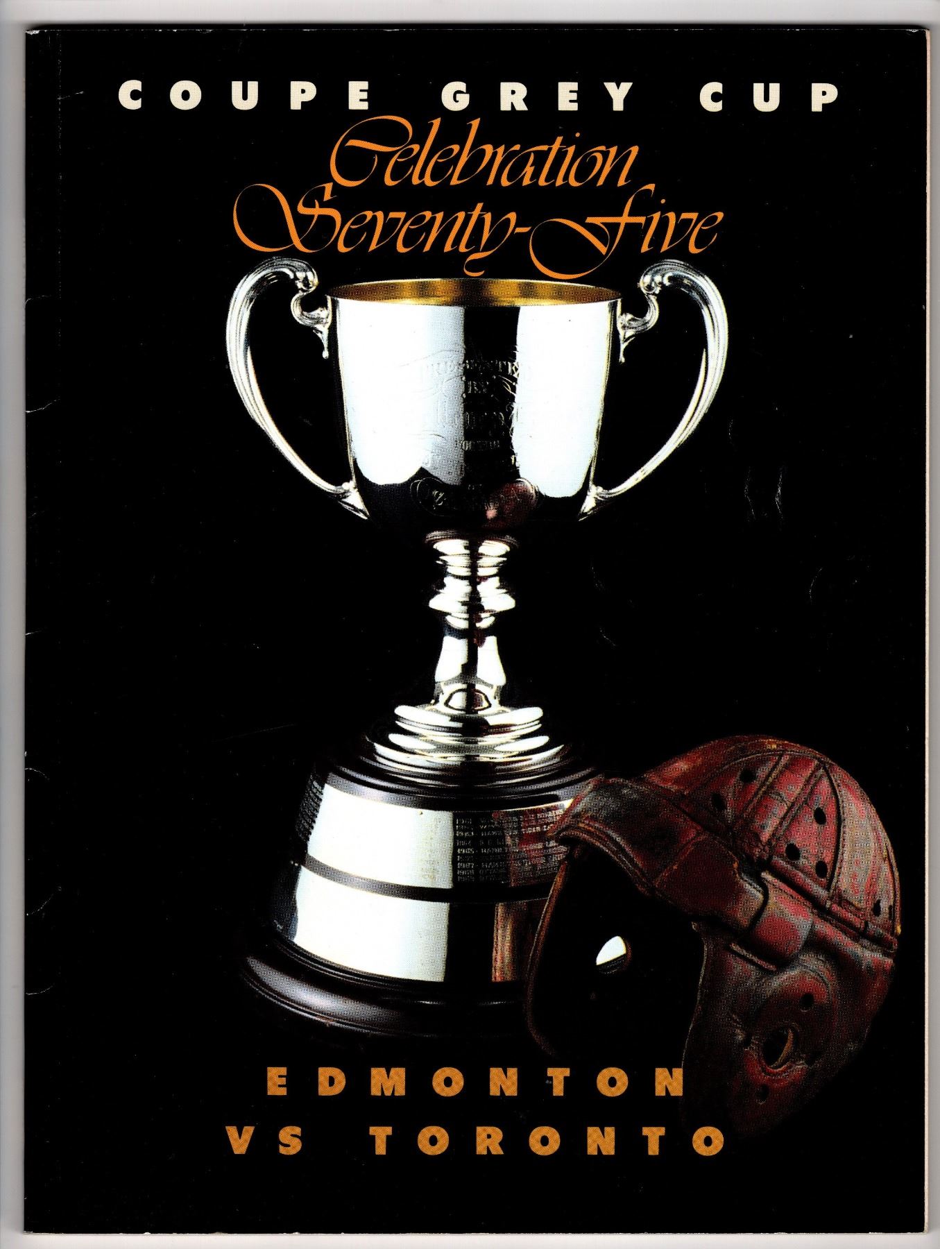 Program from the 75th Grey Cup, Championship of the Canadian Football League, Edmonton vs Toronto. Condition is Excellent. Epic record-setting 112-yr TD from Gizmo Williams in this one!