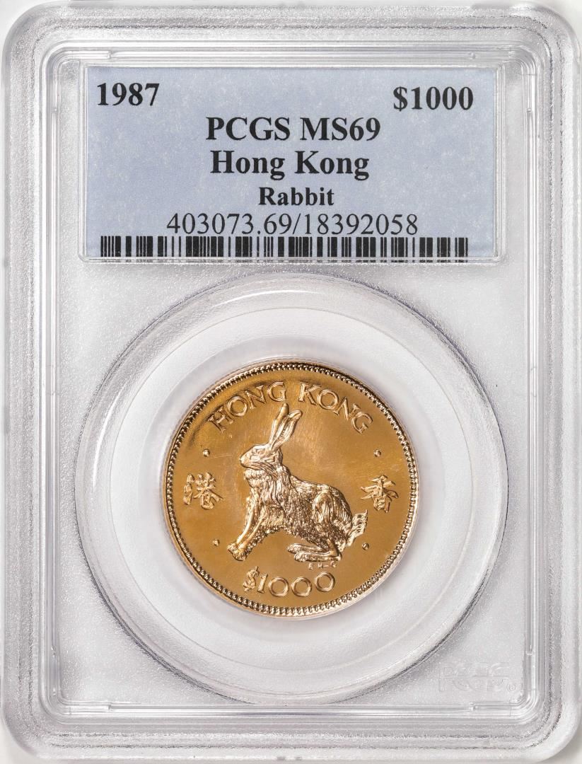 One 1987 Hong Kong $1000 Rabbit Gold Coin PCGS MS69. PCGS Graded.