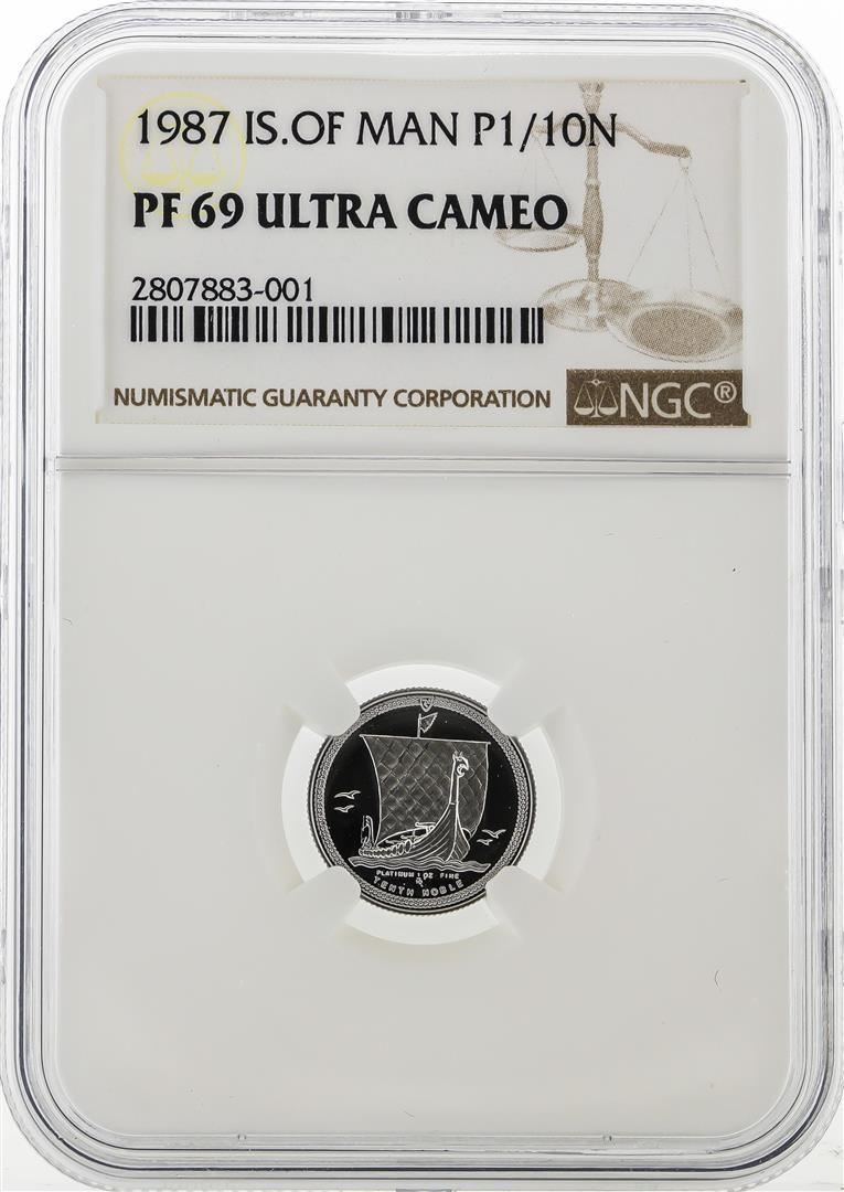 One 1987 Isle of Man 1/10 Ounce Platinum Coin NGC PF 69 Ultra Cameo. NGC Certified.