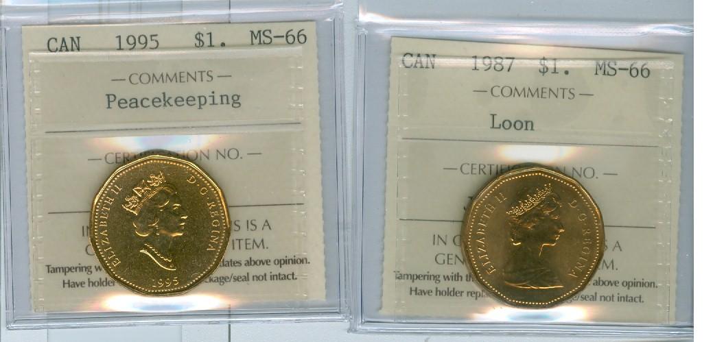 1987 Loon & 1995 Peacekeeping Loon. Lot of two coins both ICCS MS66