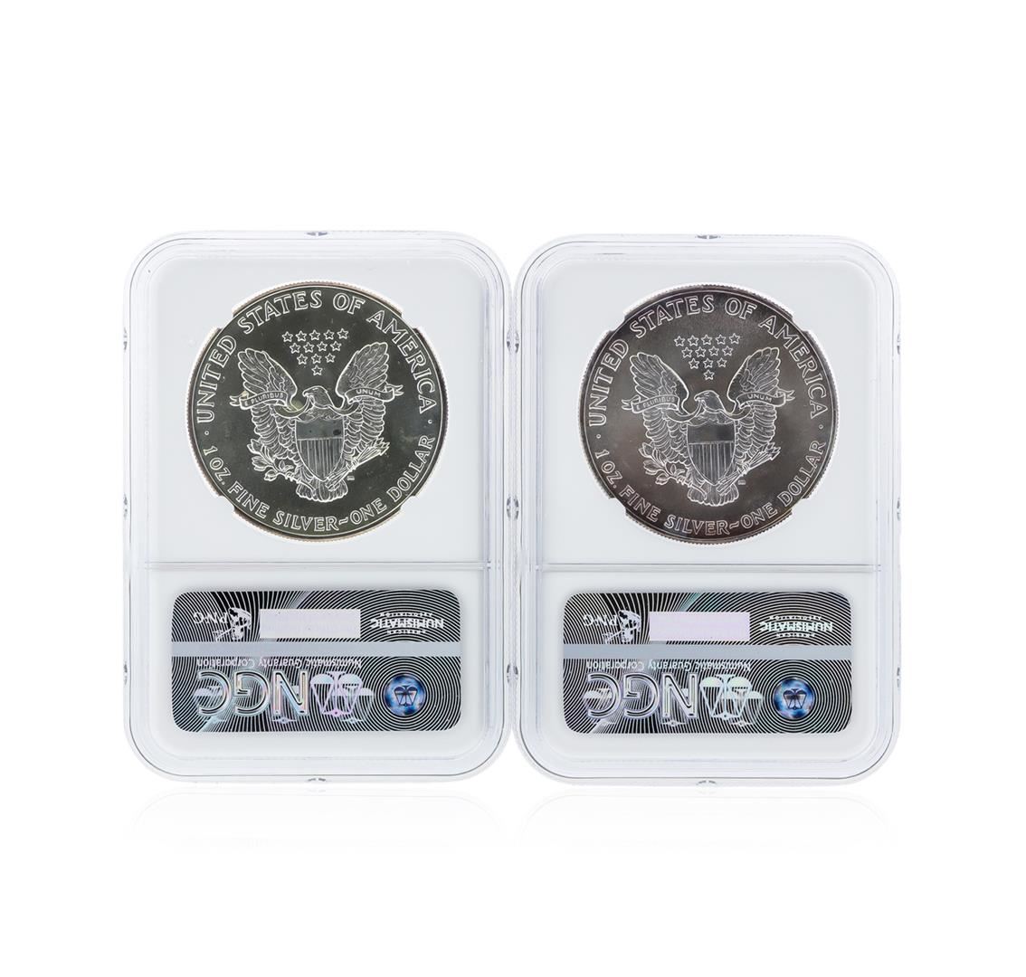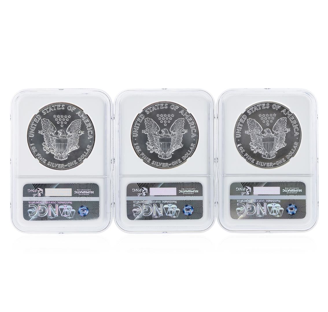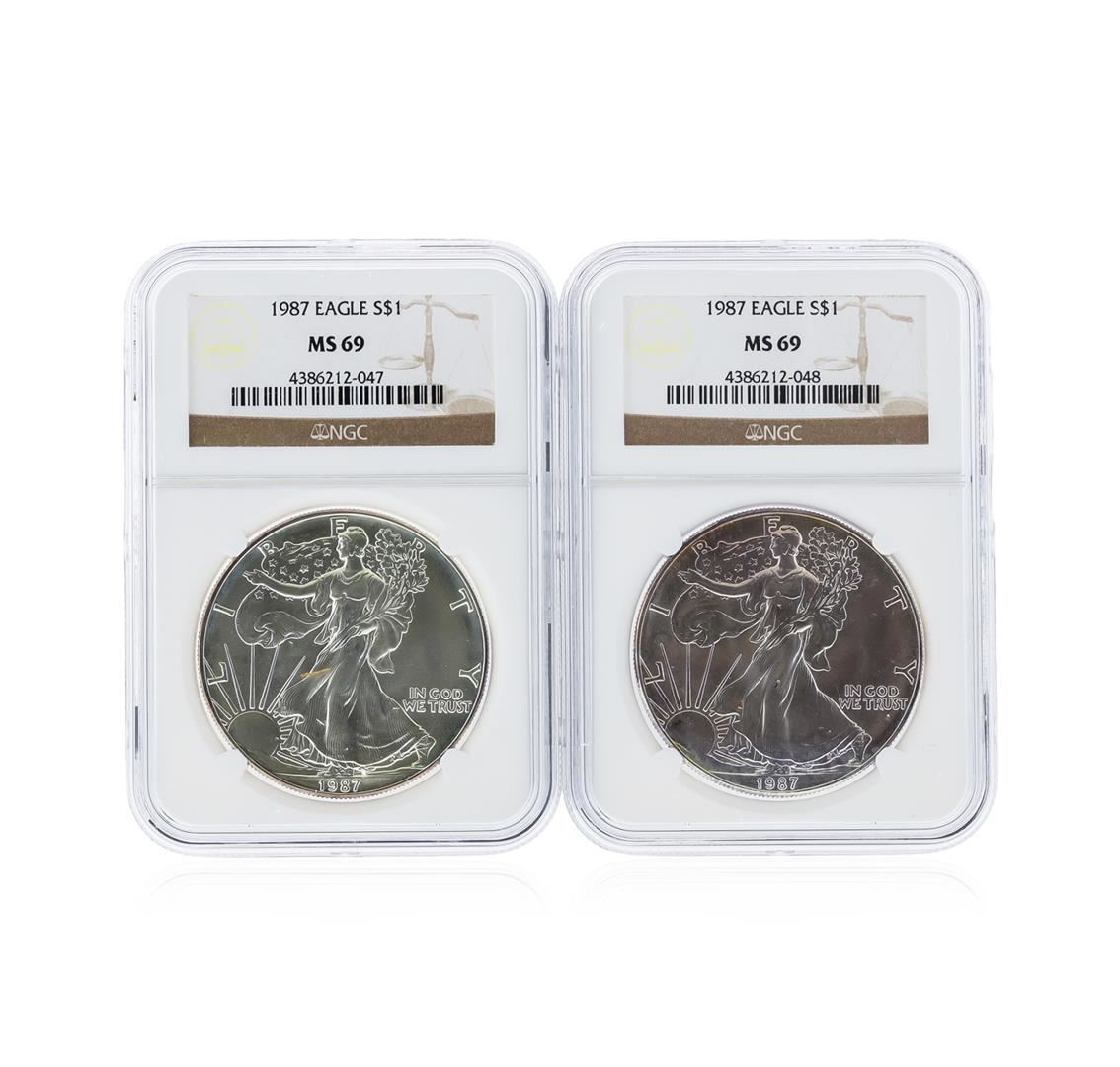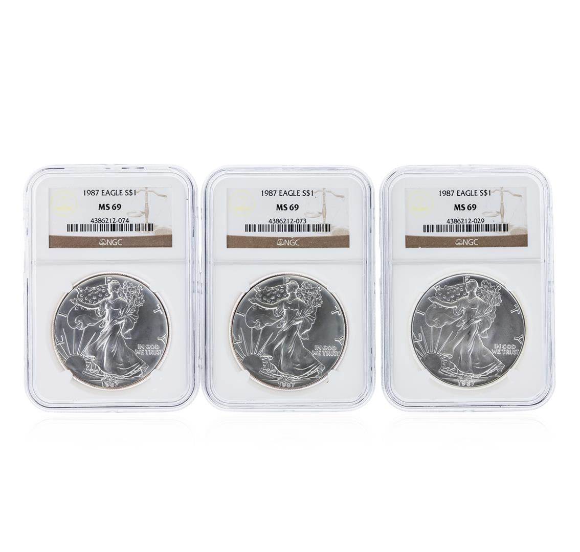 One 1987 NGC MS69 $1 American Silver Eagle Coin Set. The set features five 1987 NGC MS69 $1 American Silver Eagle Coins. NGC Certified.
